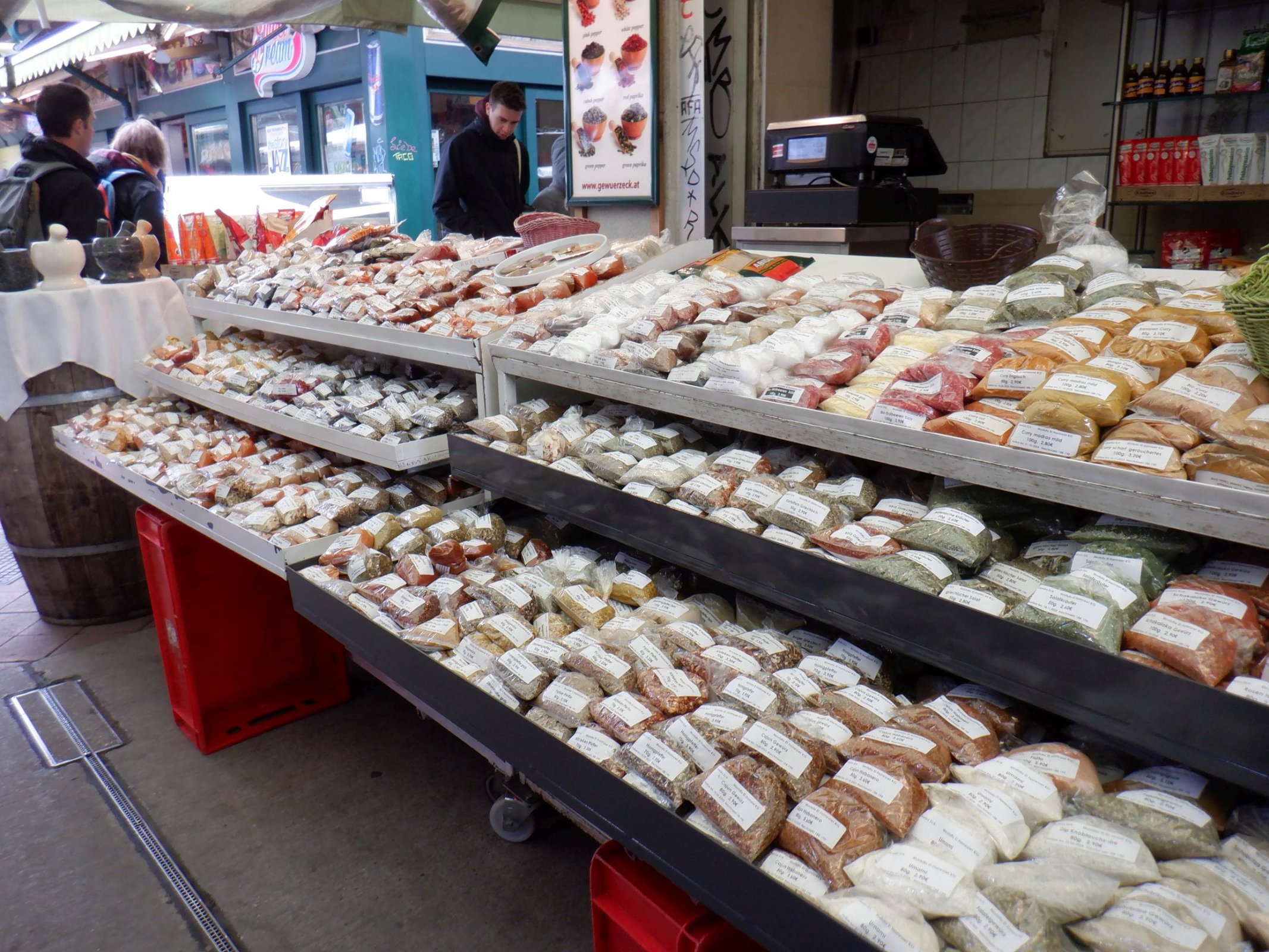 Obchodníci nabízí vše, co člověk může i nemusí potřebovat. Nás zaujalo především exotické koření, různé druhy oříšků, sýry, šunky, klobásy, sezónní ovoce a čerstvá zelenina, ale i zajímavé suvenýry.
