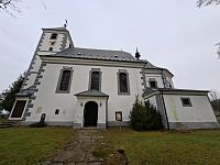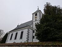 K hranolové věži přistavěné k západnímu průčelí přiléhá kryté schodiště na půdu. Presbytář má střechu valbovou, z jejíhož hřebene vyrůstá drobný sanktusník s cibulovou stříškou. Střecha kostelní lodi je sedlová, na východě s menší polovalbou. Věž má střechu stanovou, sakristie pultovou. Krytina všech střech je stejná, plechová.