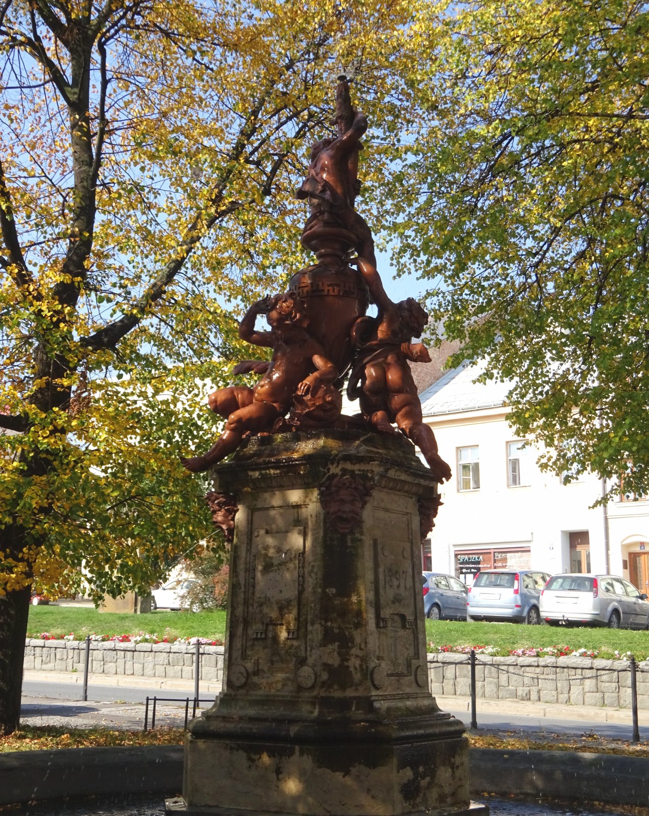Na náměstí v Odrách v místě, kde se nyní nachází kašna, stávala radnice, která byla v r. 1863 zbourána. Kašna byla vytvořena v r. 1897 dle návrhu vídeňského sochaře (oderského rodáka) Emila Zimmermanna. Datum vzniku je vyryto na podstavci. Vodní nádrž má v prúměru 6 metrů a uprostřed na podstavci je umístěna váza, na které sedí dítě, jež krotí rybu, chlící vodu. Nahoře v rozích podstavce jsou umístěny chrliče vody. Dalším motivem na kašně jsou dvě děti s husou. Reliéf císaře Josefa II. z přední strany byl po I. svět.válce odstraněn.