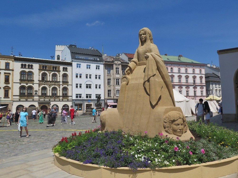 Na zdejším Horním náměstí se totiž objevila – na přelomu května a června již tradičně vznikající - obří socha z písku. Představuje opět ženu, ale tentokrát ne zcela určitelnou a pojmenovatelnou. Jedná se o Alegorii svobody a demokracie i připomínku tři výjimečných olomouckých žen, hrdinek unikátního komiksu Tři královny. Těmi jsou Květoslava Bartoňová, Erika Bednářová a Zdena Mašínová, do jejichž tváří můžeme pohlédnout ve spodní části sochy.