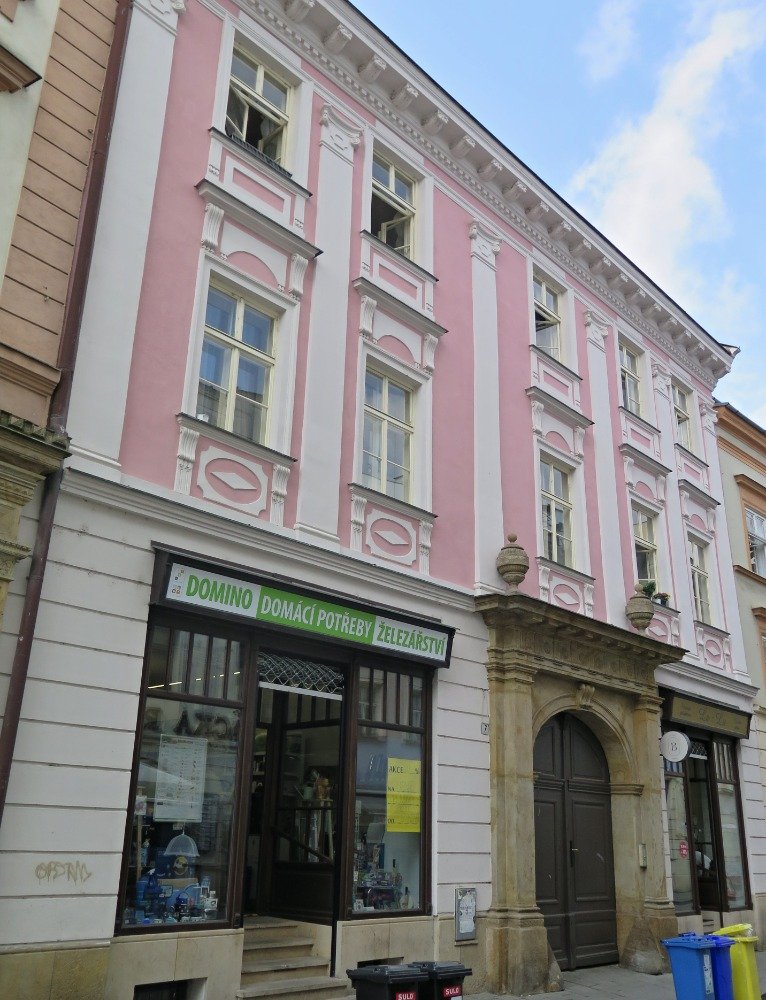 Před sebou zde máme dvoupatrový dům, který vznikl spojením dvou starších samostatných objektů a na první pohled zaujme zejména svým monumentálním klasicistním portálem zaklenutým stlačeným obloukem. Jeho postranní pilastry nesou římsu s triglyfy a rosetami, na které stojí vázy. Po obou stranách portálu můžeme vidět novodobé výklady a přízemní pásovou bosáž.