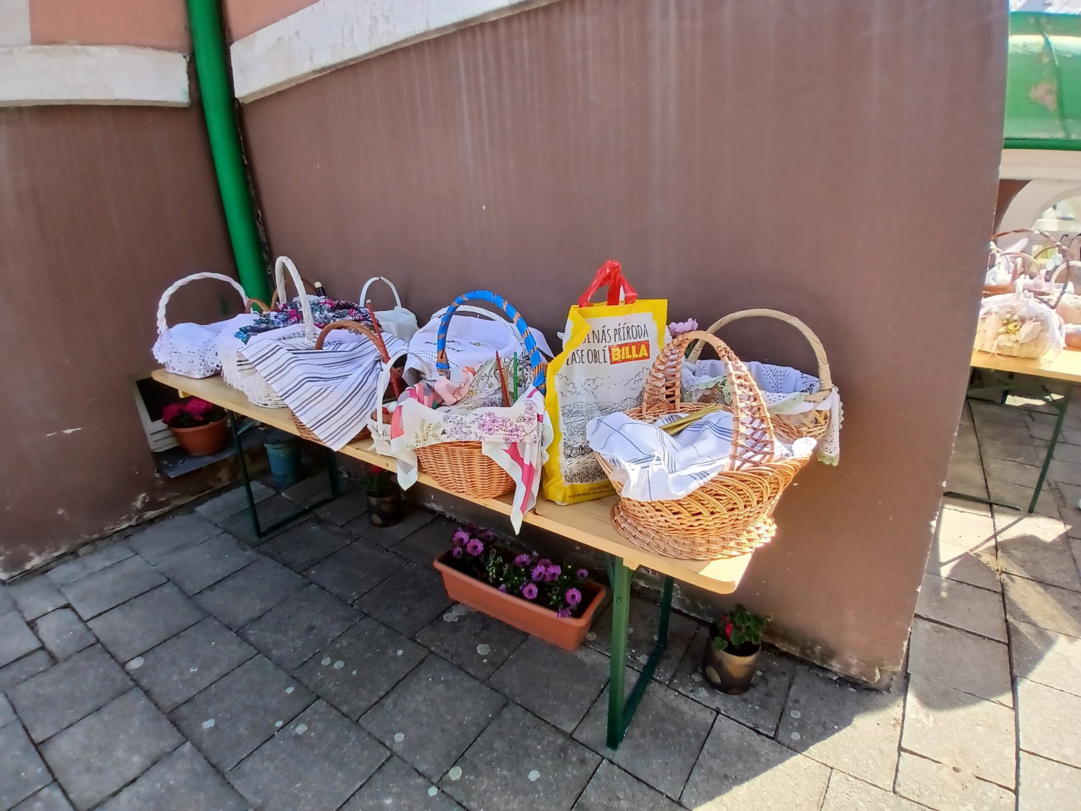 sviatočne vyobliekaní ľudia s košíkmi - paskami pred chrámov sv. Gorazda