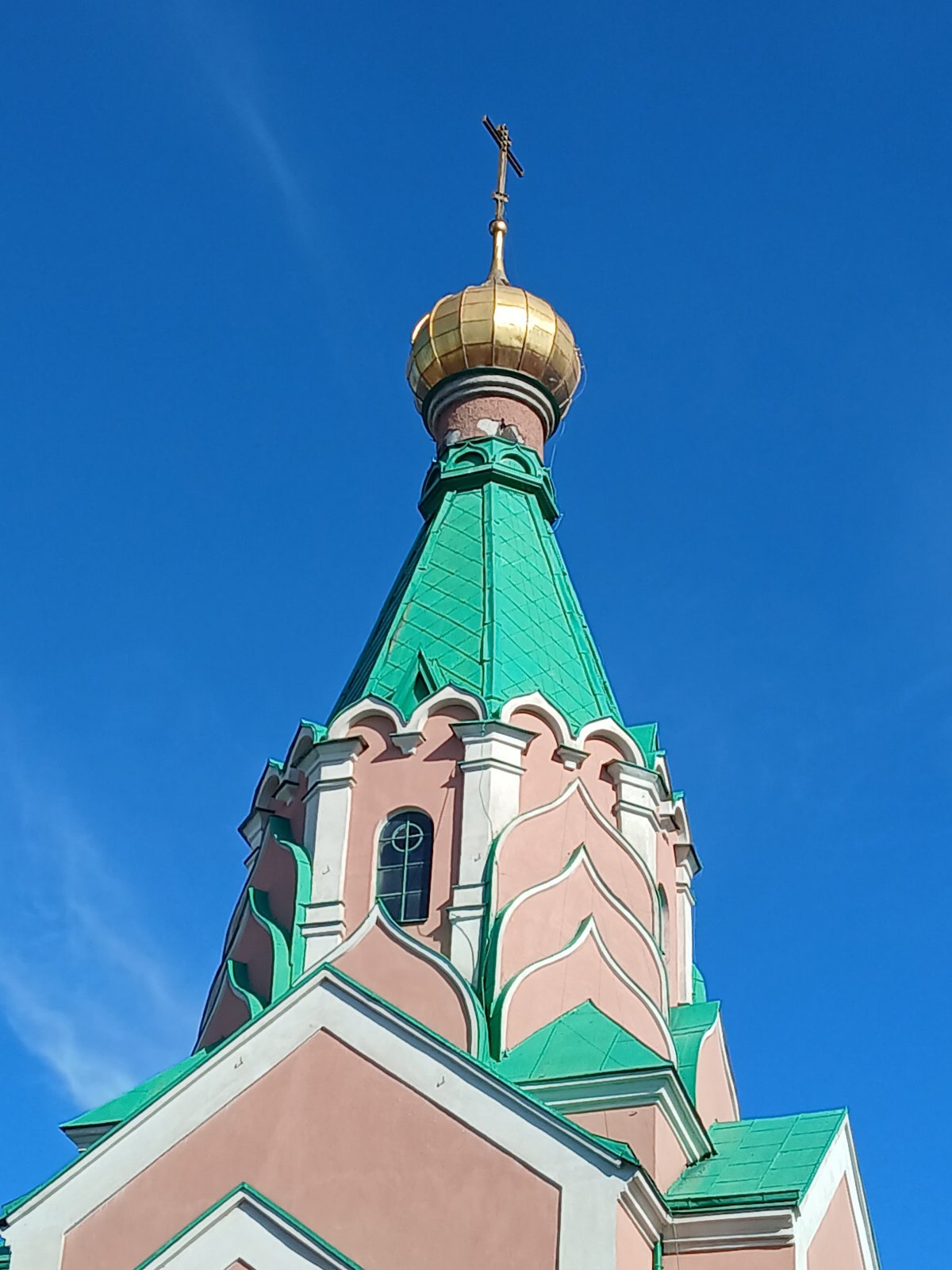 najvyššia šesťboká veža s vysokou ihlanovou strechou ukončená cibuľovou pozlátenou bankou s krížom