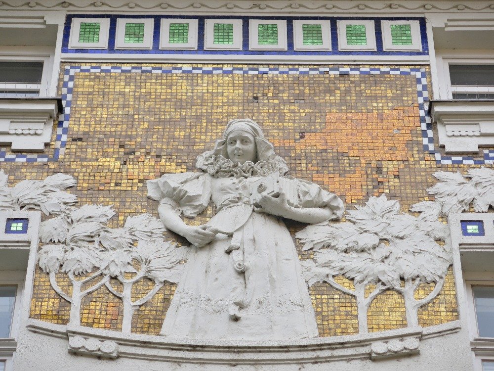 Uliční průčelí uprostřed zdobí vysoký reliéf tříčtvrteční ženské postavy v hanáckém kroji, která v rukou drží fotografický přístroj (údajně se jedná o připomínku stavebníka – fotografa, který měl v domě také svůj ateliér). Výjev lemuje dekor v podobě listnatých stromů. Celé hlavní průčelí završuje vlys a římsa pokrytá zlatou, zelenou, modrou a bílou mozaikou. Nad římsou jsou na okrajích budovy umístěny dvě dekorační vázy s mozaikovými výplněmi.
