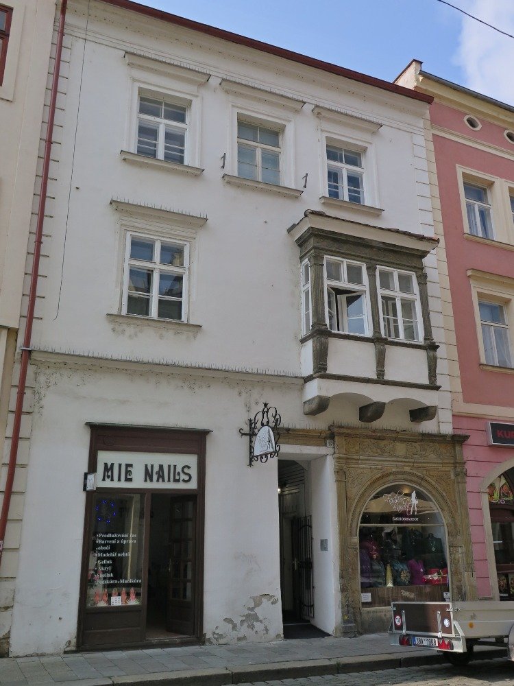 Tento dvoupatrový dům charakterizuje naprosto rozdílná podoba všech podlaží. Horní – tedy 2. patro – má tři okenní osy, v 1. patře se kromě jednoho okna nachází arkýř s ornamentálními reliéfy v parapetu. Přízemí dominuje renesanční profilovaný portál s nápisem, který původně vedl do mázhausu a dnes je výkladem obchodu.