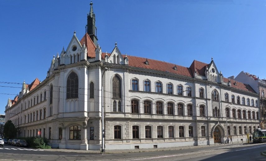 Historizující - převážně neogotický - a bezesporu monumentální objekt tohoto olomouckého vzdělávacího ústavu se nachází na křižovatce Palackého (č. 10) a Pöttingovy ulice a ve své dnešní podobě byl vybudován v letech 1894 až 1895 stavitelem Karlem Starým, a to podle projektu arch. Jakoba Gartnera. Hned v roce 1899 byl ovšem projekt školního areálu rozšířen arch. Kulhánkem, aby jej následně ještě upravil arch. Karásek.