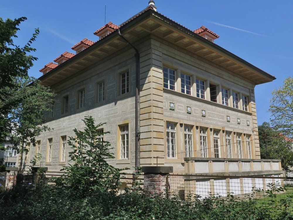 Součástí nápisových polí na fasádě jsou také údaje o stavebnících, projektantovi i staviteli a mezi okny zahradního průčelí jsou navíc umístěny medailony se symboly různých povolání.