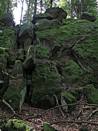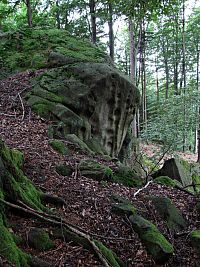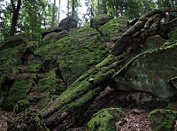 Dlouho jsem si myslel, že je tento Slunečný kámen nejvyšším útvarem „Předních skal.“ Při letošní návštěvě lokality, když jsem se za tábořištěm snažil vyfotit ty nejpozoruhodnější skalní útvary, mne nožky kvůli záběrům donutily sestoupit i k jejich úpatím. Byl jsem tady na Ondřejovsku už mnohokrát, ale na tomto místě ještě ne, a tak jsem zůstal překvapen stát pod vysokou stěnou mrazového srubu. Je sice rozdrobena až běda, ale díky svým nad sebou umístěným „patrům“ nad mou hlavou vystupovala ještě o dalších 5 až 6 metrů a je tedy v „Předních skalách“ tou stěnou nejvyšší.