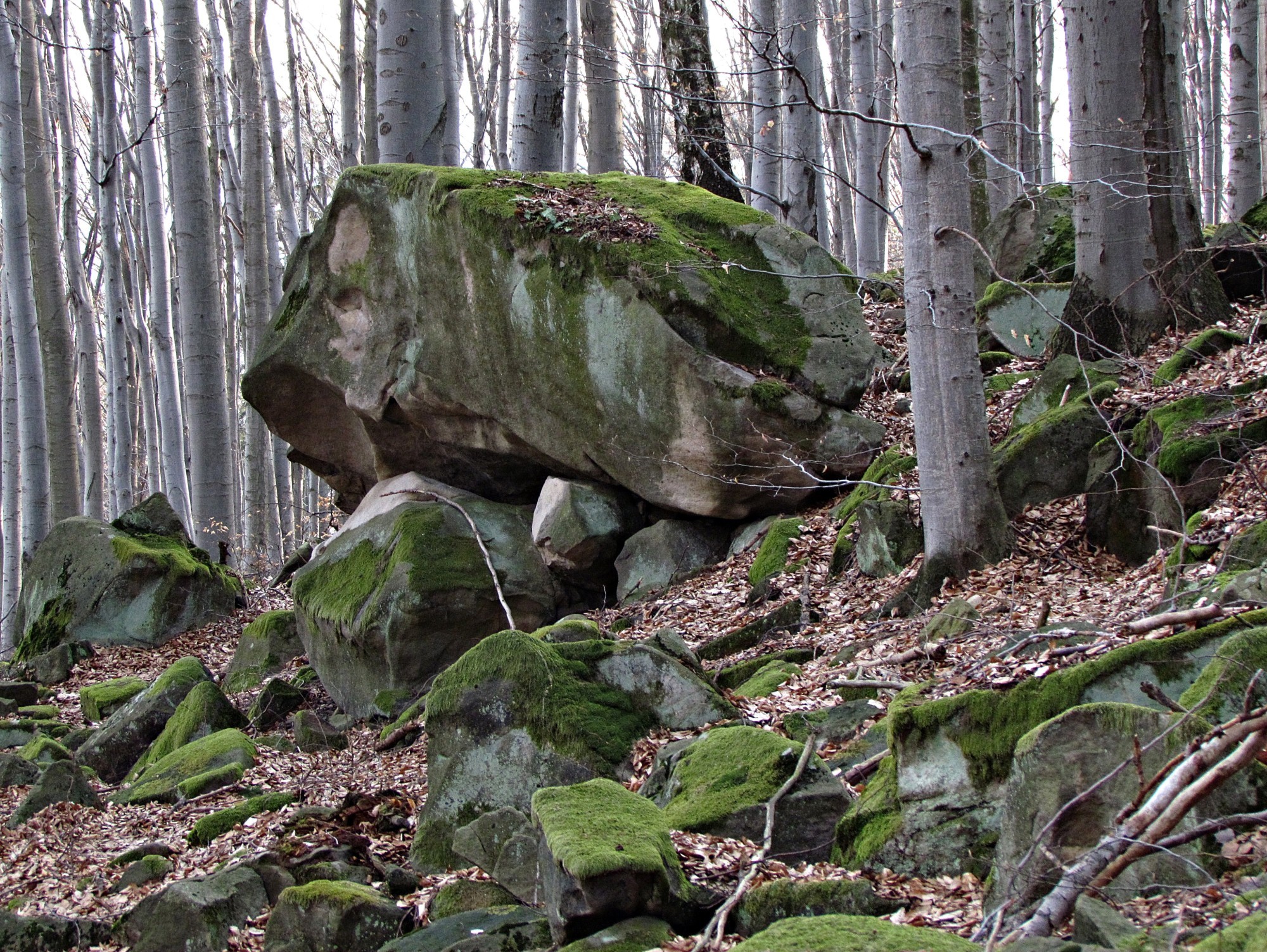 I tento na první dojem nezajímavý chaos všude okolo nás má svůj skrytý divoký půvab a řád. Svah pod úbočími zbylých stěn mrazových srubů není totiž pokryt jen sesouvajícími se kameny a ohromnými balvany, ale v různé úrovni svahu ze země trčí i menší skalky, o které se místy padající kamení zastavilo. Celá tato - pro někoho nevzhledná divočina, je velmi cennou ukázkou učebnicového rozpadu mrazových srubů a vzniku kamenitých sutí. Nahoře nad námi na temeni hřbetu se totiž kdysi dávno pravděpodobně rozkládaly daleko vyšší skaliska a možná i skalnaté hradby, do kterých se ale za ty věky zakousla s mimořádnou chutí věčně hladová eroze a rozcupovala je napadrť. Pod úbočími kamenných a balvanitých sutí se dá při trošce opatrnosti celkem snadno projít východním směrem až pod poslední ukázku "kamenného zmaru." A nejspíš to nebude procházka vykonaná svižným krokem, neboť vás zcela určitě zaujmou mnohé bizarní útvary a patvary, vystupující z toho chaosu nad zemský povrch.