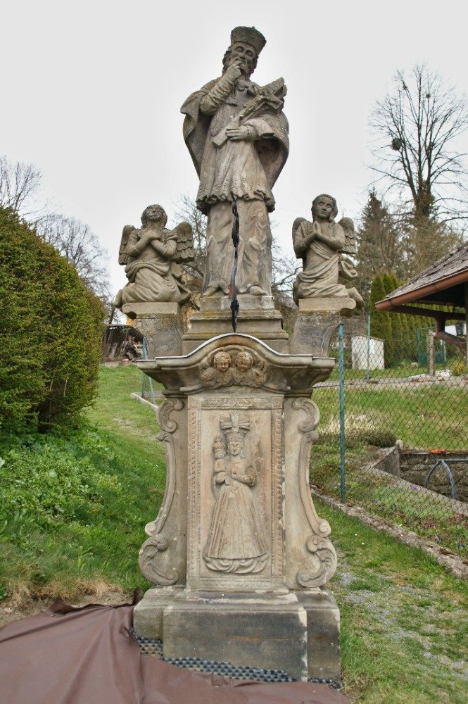 Pískovcová plastika stojí na trojdílném hranolovém podstavci. Střední část s postranními volutami je na čelní straně ozdobena reliéfem zobrazujícím Pannu Marii s dítětem. Jan Nepomucký stojí v kontrapostu a „doprovází“ ho obvyklé atributy. Po stranách na volutových konzolách jsou umístěni dva klečící andílci (ti byli v minulosti ukradeni a při opravě sousoší v roce 2007 je nahradily kopie).