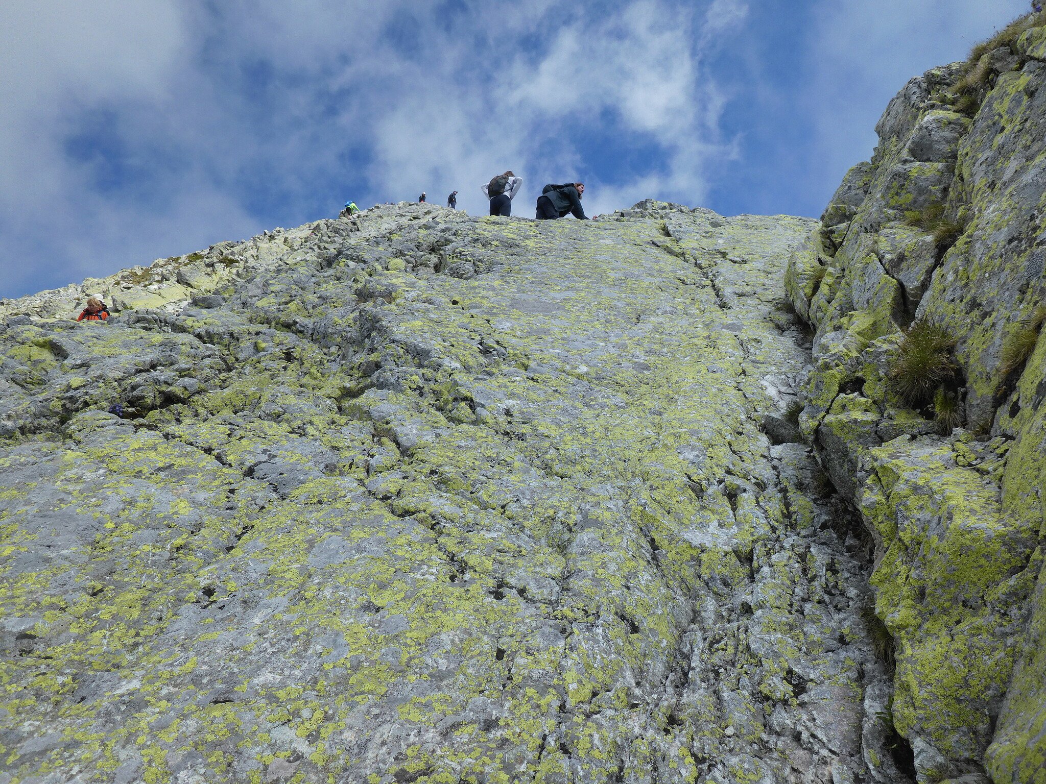 Dostávám se i k zajímavé plotně, která se mi na první pohled zalíbila a tak jsem si umínil, že polezu přesně po ní. Na fotkách se podařilo něco, co se stává jen málokdy. Až jsem si je doma prohlížel, tak tato fotka vyšla jak má – místo na ní vypadá mnohem majestátněji než ve skutečnosti. I tak byla několik metrů vysoká a poměrně strmá plotna zajímavou zkouškou psychické odolnosti. I z toho pohledu jsem to musel v rámci tréninku zkusit. Vyšlo to dobře, dokonce zde bylo i tak akorát jistých míst. Za chvíli jsem nad ní a kochám se pohledem dolů. Určitě jsem s touto svou velkou – malou zkouškou spokojen. Na druhou stranu si říkám, jaké zkoušky mě ještě po cestě nahoru asi potkají a hlavně se mi v hlavě už delší dobu honí myšlenka, jak tudy polezu dolů, když ani nahoru to není úplně snadné. Přiznám se, že toto je pro mě velkým překvapením – na to, že se jedná o „Horu všech Slováků“ a že zde chodí všichni, se zdaleka nejedná o cestu snadnou, zcela bezpečnou a nepochybně má v sobě i ne úplně malou míru rizika. Toto je věc na kterou si u Tater budu muset asi ještě nějakou dobu zvykat. Inu, že cestu nelze vymyslet, tak aby byla prakticky stoprocentně bezpečná. Vždy je zde menší nebo větší míra rizika, které inu musí každý přijmout (a nebo do Tater nechodit) a neovlivní je, v nejlepším případě jen trochu omezí.