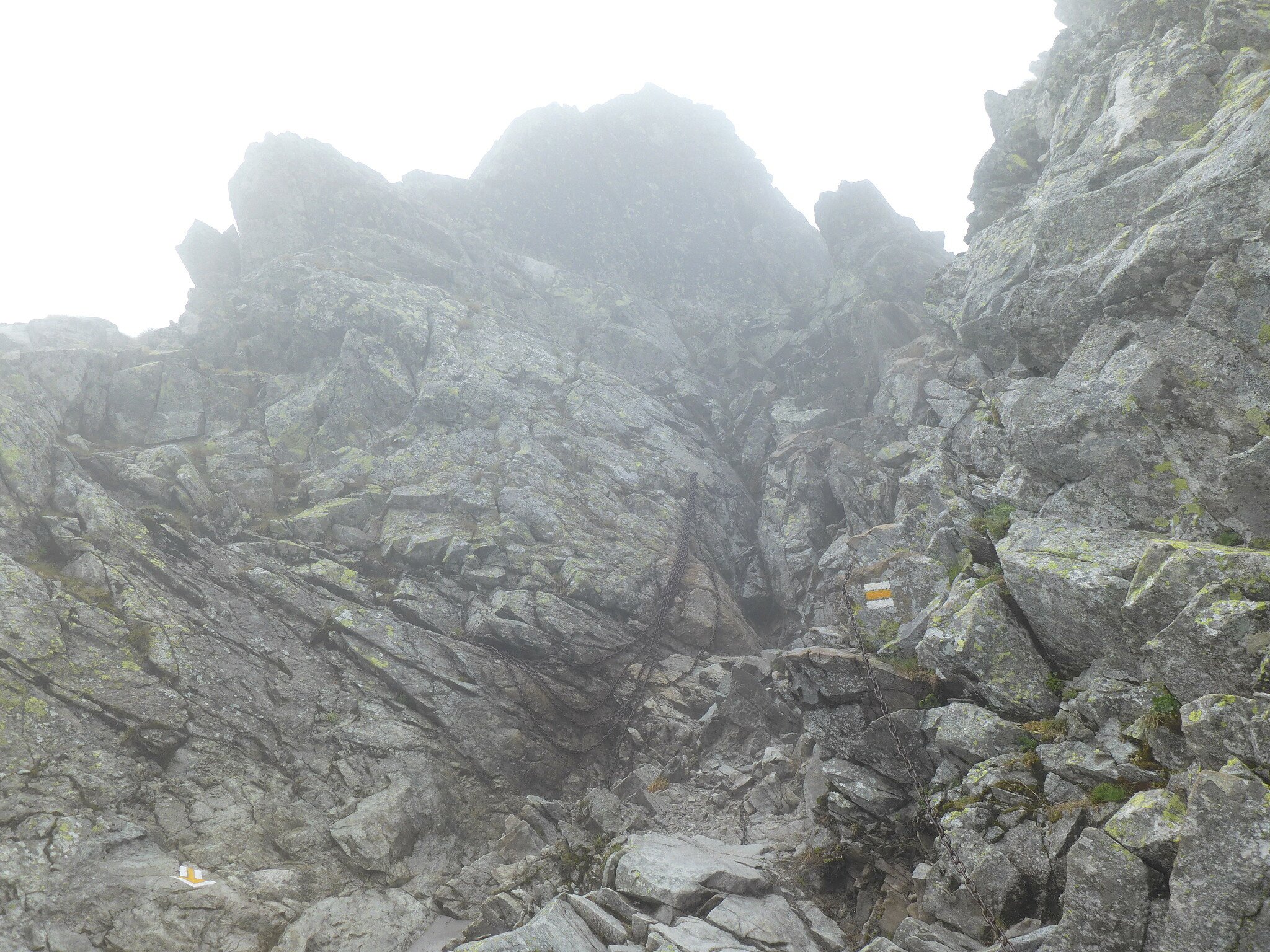 Naopak na druhou stranu je dobré tolik nespěchat a u řetězů si nejprve trochu promyslet svůj postup – kam dát nohy a ruce. Určitě je ale důležité pevně se řetězů držet. V případě špatného odhadu jsou tou nutnou jistotou. Asi i z toho důvodu, že jsem chtěl být honem honem pryč z psího počasí, jsem si v poněkud obtížnějším místě nedal tolik času na promyšlení kroků, jak bych měl a tak byl sestup o nějaký půl až metr výšky delší a rychlejší než jsem předpokládal. Ani to tak nebyl krok, jako spíš nečekaně rychlé spuštění se po řetězech. Toto je další z obtížnějších míst a je vhodné nespěchat.