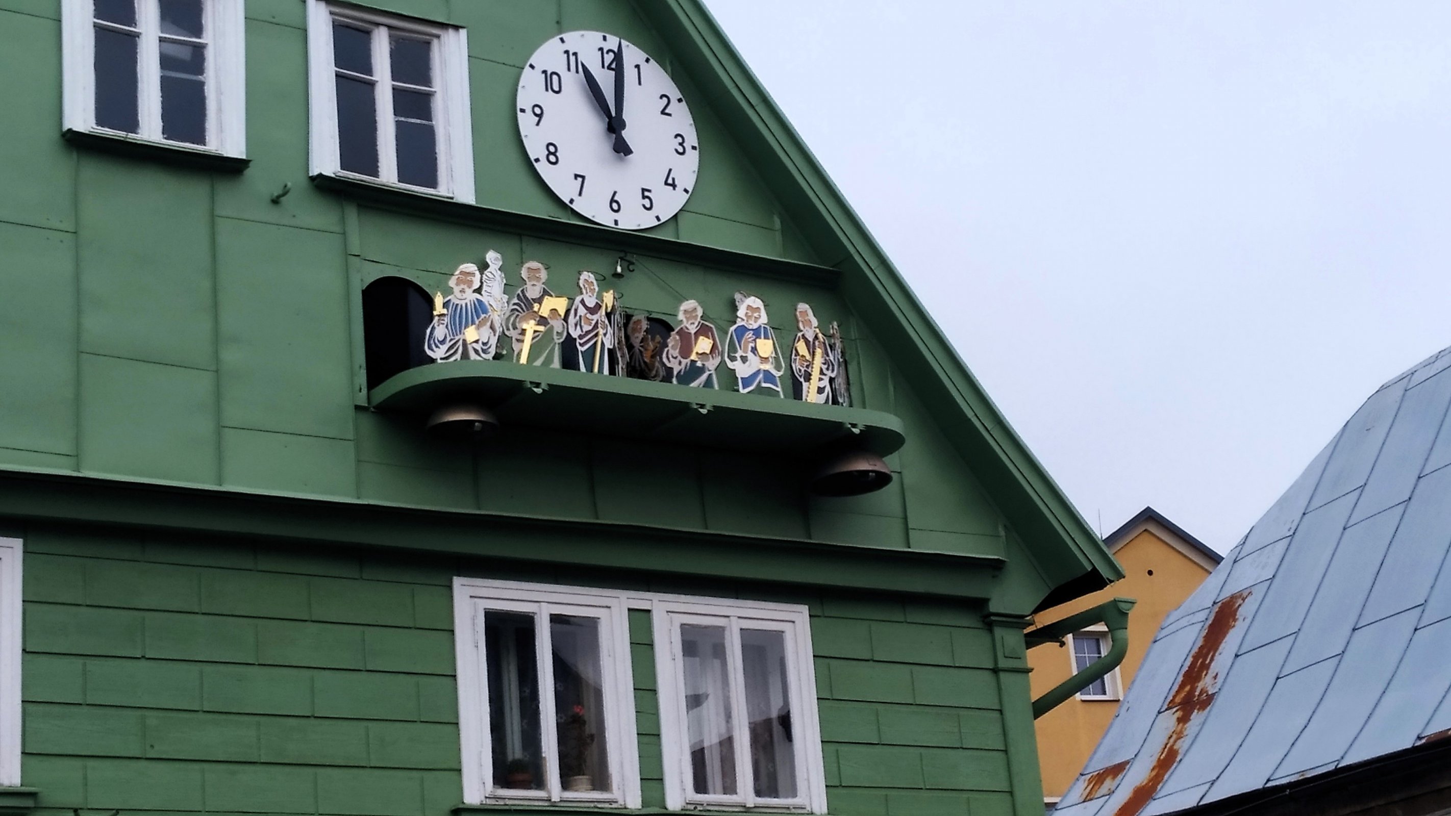 Orloj tvoří 12 světců, smrťák a rytíř Roland. Sochy jsou vyrobeny z kovu a skla, jsou vysoké 45 cm.
