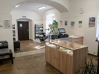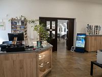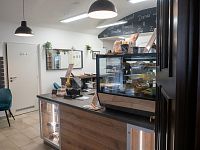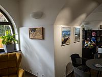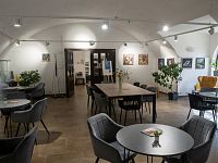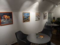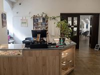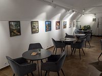 V těsném sousedství, tedy vlastně volně průchozí z IC je sousední výstavní síňka s posezením, kde se střídají umělecké výstavy, aktuálně to byla malířka Vlasta Francová (do 30.4.2026). Místnost s posezením je ale spíše součástí Café Osek, tedy kavárny (i cukrárna), která má svůj prodejní pultík hned za dalšími dveřmi (z venkovního pohledu zcela vlevo). Kavárna není určená k večernímu a nočnímu hýření, otvírací doba je podobná jako v íčku. V nabídce je spousta druhů kávy, i nějaké další horké nápoje. K zakousnutí nějaké cukrovinky i trošku tvrdšího pití (i nealko pro abstinenty).