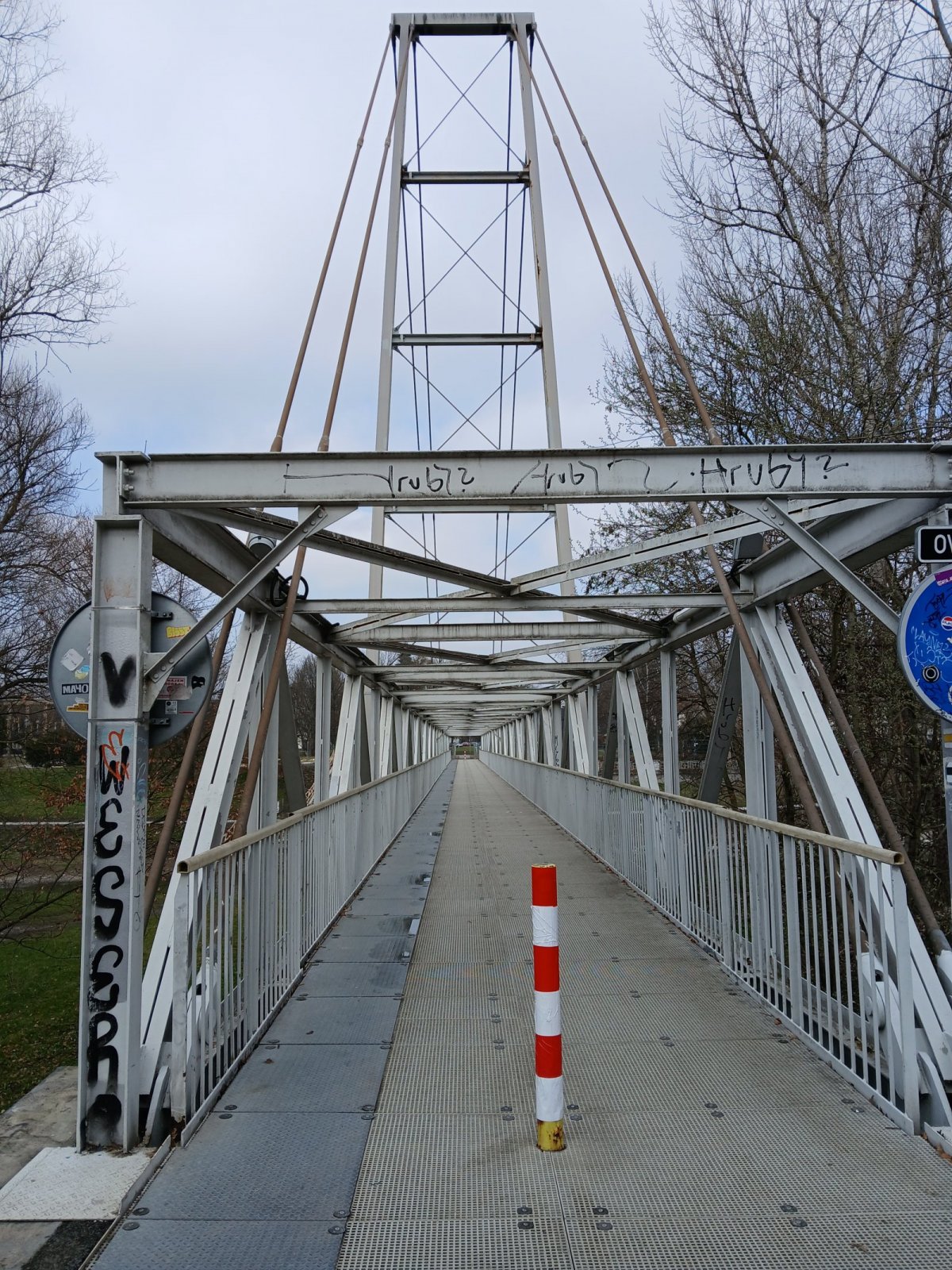 Z pôvodného miesta nad riekou Odrou konštrukciu lávky zdemontovali v roku 2003 a postupne ju premiestnili na dnešné miesto. Po úprave a oprave ju premostili ponad tok rieky Ostravice a pre verejnosť ju otvorili 14. mája 2004. Prechodná šírka lávky je približne 4 metre, jej dĺžka je 95 metrov, povrch lávky tvoria kovové plechy a rošty. Nosnou časťou priehradovej konštrukcie lávky je nosný stĺp zhotovený z dvoch profilov v šírke lávky, z ktorého po oboch stranách vedú dva páry nosných lán. Táto hlavná nosná časť je umiestnená na brehu Slezskej Ostravy. Lávka je veľmi dobrou spojnicou dvoch časti mesta, ideálna z centra k hradu. Je to aj slušné vyhladkové miesto na sútok Ostravice a Lučiny a aj do okolia.
