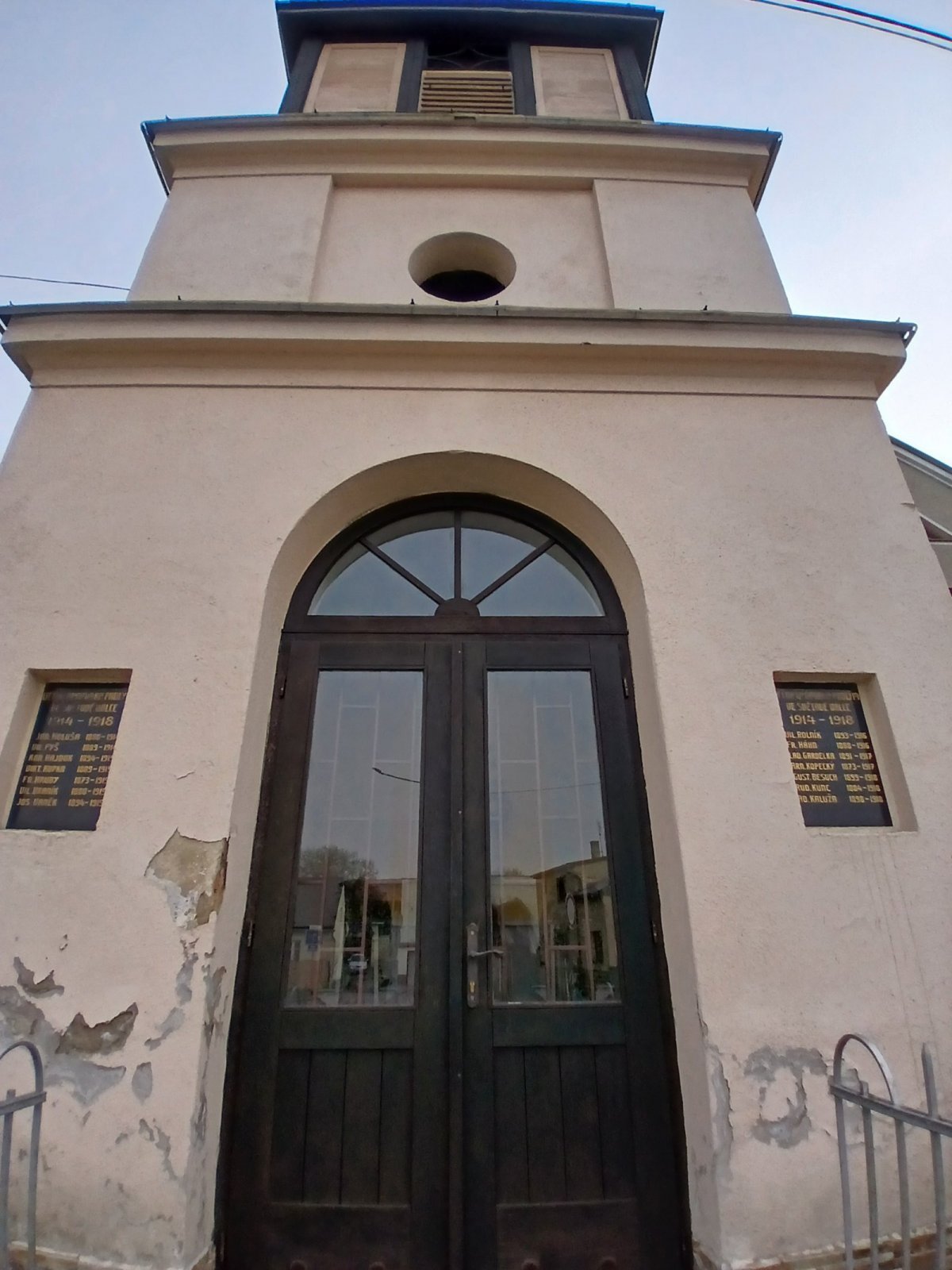 vchod do kaplnky, po bokoch pamätné dosky s menami padlých v 1. svetovej vojne