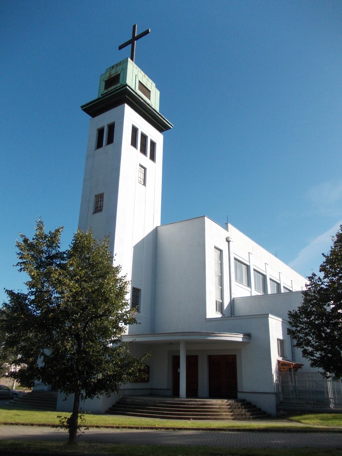 Veža je vysoká 28 metrov, má netradičnú hranolovitú strechu pokrytú plecom, nad ňou je šest metrov vysoký kovový kríž, ktorý je v noci osvietený neonovým svetlom.