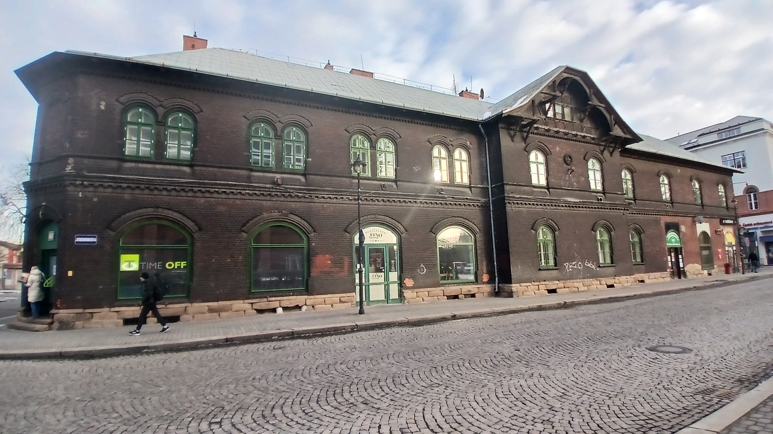 Jedna z týchto budov - postavená východne od kostola je jednoposchodová murovaná budova má v pôdoryse tvar písmena U, je postavená pre Vítkovice v minulosti z tradične červenej režnej tehly s polovalbovou strechu s plechovou krytinou. Priečelie od ulíc Mírové náměstí, Věžní a Zalužanského sú členené rímsami, profilovaným ostnením, okná a dvere majú polkruhový záklenok. Štít priečelia od ulice Mírové náměstí je zdobený hrazdením. Asi najkrajší pohľad je na trojstranné dvorné priečelie budovy a jeho priebežnú železnú krytú pavlač. V minulosti boli v dome jedno, dvoj a trojizbové byty pre robotníkov a úradníkov, išlo o 39, respektíve 42 bytov. V dvore budovy je dnes parkovisko s vchodom cez závory, od ulice je popolnicová výzdoba (problém odvozu odpadu sa musí riešiť). Ani to ale nezoberie nič na kráse zelenej kovovej pavlače. V prízemnej časti budovy majú sídla rôzne firmy a iné podnikateľské činnosti, je to napríklad kozmetika Yevheniia Volynets, Ooroda, Bistro Fino, Potravinová banka, Potraviny - večerka, Pivnice u Tučňáka.
