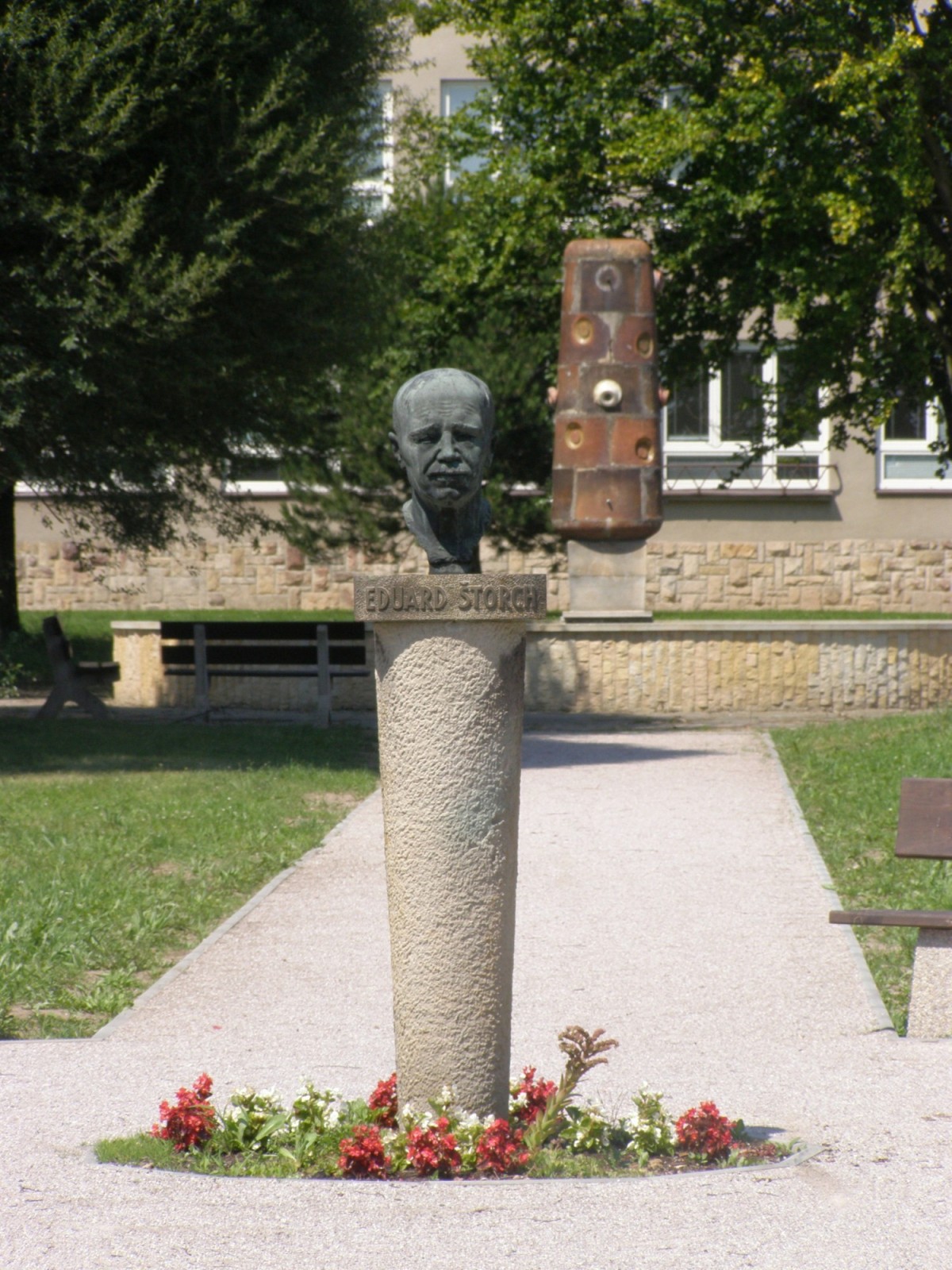 Pomník s bystou Eduarda Štorcha, ostroměřského rodáka, archeologa a spisovatele pravěku, se nachází na prostranství před základní školou, která nese spisovatelovo jméno, tedy před ZŠ Eduarda Štorcha. Bysta byla odhalena v roce 1978 u příležitosti 100. výročí spisovatelova narození. Autorem pomníku je sochař Josef Bílek.