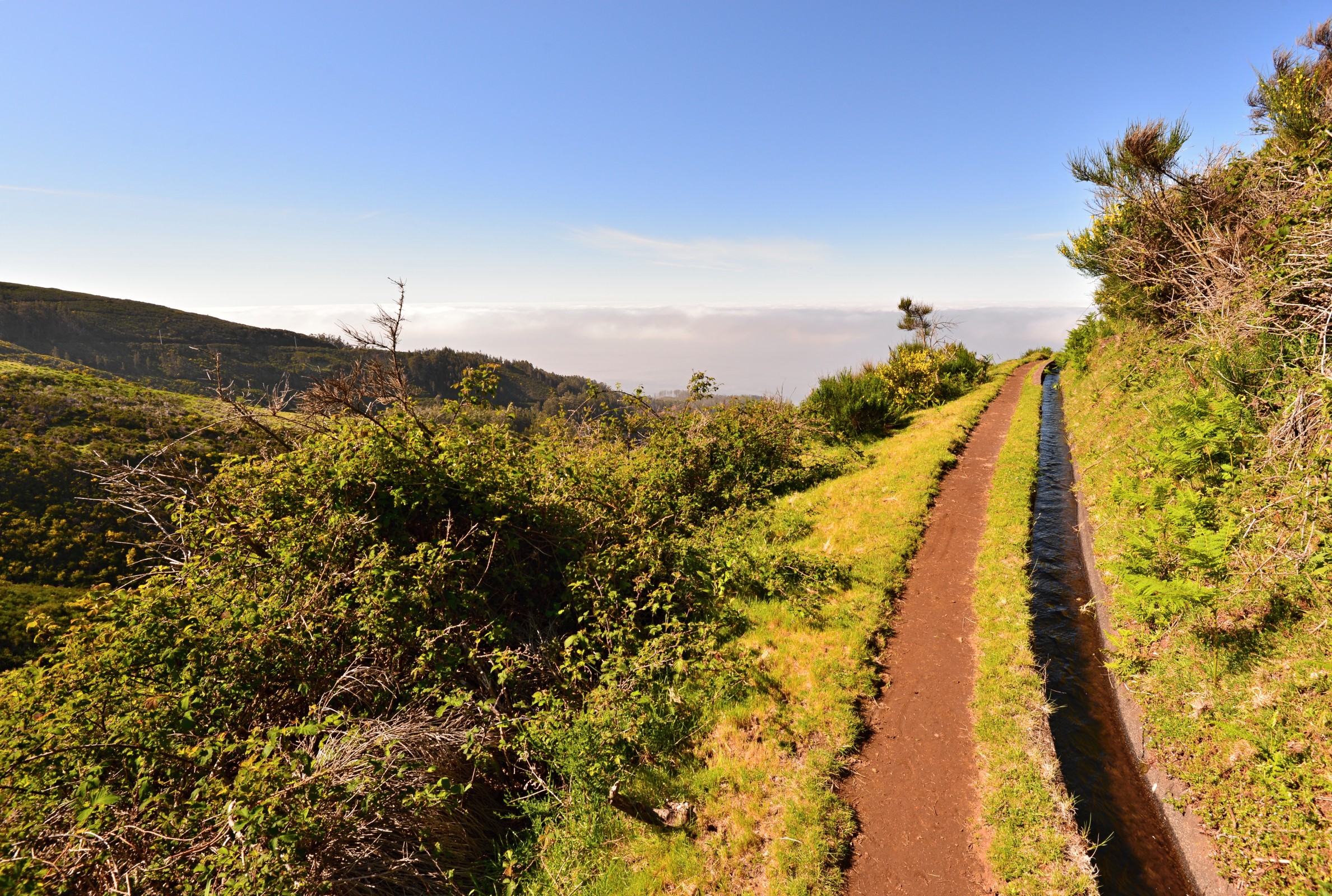Na mapách je v blízkosti sochy Cristo Rei zakreslené parkoviště. Žádné tu není. Je tu jen pár vyježděných míst podél silnice. Na jednom z nich parkujeme. Jdeme kolem ohrady s kravami ležícími pod sochou Krista, až narazíme na levádu. Leváda do Paul vede pastvinami a není na ní žádné obtížné místo. Jde se stále podél svahu téměř ve stejné nadmořské výšce. Voda teče směrem od Cristo Rei, takže nazpět půjdeme proti proudu. Spád je ale tak mírný, že jej skoro ani nepoznáte.
