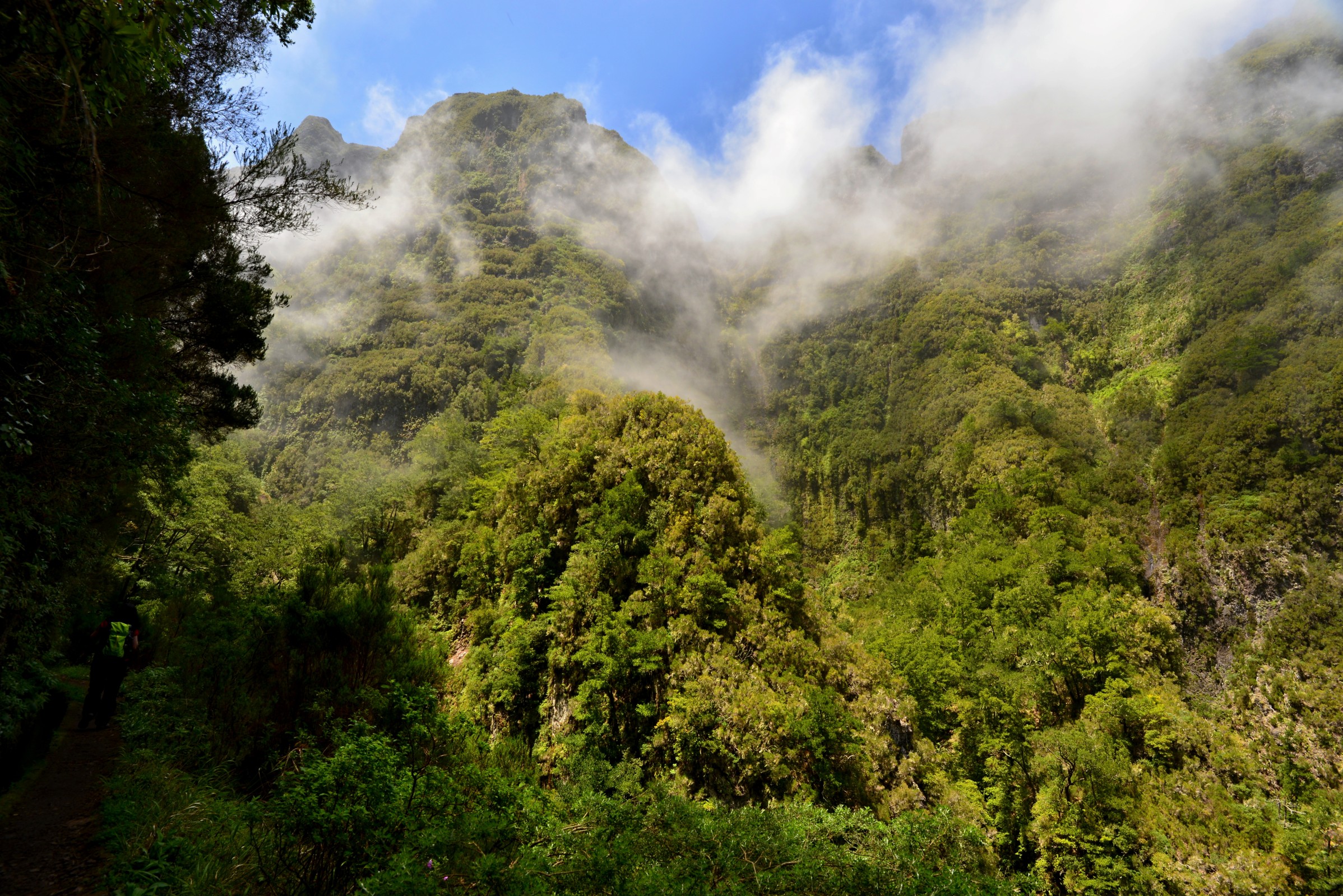 Od Queimadas jdeme tedy směrem na Caldeirão Verde (Zelený kotel). Jsme v nadmořské výšce 883 m. Nejprve vede poměrně široká cesta lesem se stromy s podivnými tvary, později se pěšina zúží a nakonec se jde jen po zídce levády. Většina méně bezpečných míst je zajištěna zábradlím z ocelového lana.