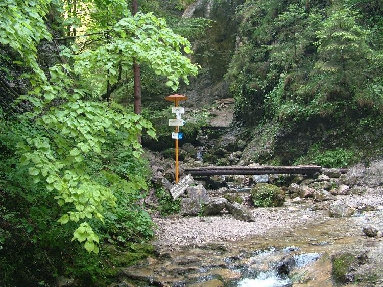 Rozcestí modré a žluté značky. Modrá vede směrem k vesnici Biely Potok, na drouhou stranu pak směr Horné diery.