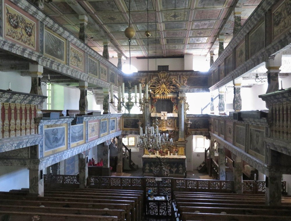 V interiéru na první pohled zaujme dřevěná dvojpodlažní galerie a kazetový strop s charakteristickou malbou Christiana Schmieda z let 1723 a 1737. Malby ve stylu grisaille, nacházející se v dolní galerii, zobrazují modlitby Páně, ty na horní galerii jsou zaměřeny na Blahoslavení. Na stropních panelech jsou vyobrazeny různé biblické příběhy, včetně Posledního soudu, které doplňují květinové ornamenty.