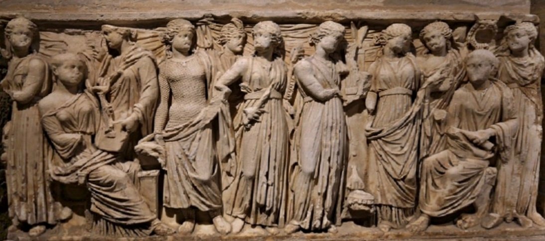 Starověký sarkofág je úžasným sochařským dílem zobrazujícím korunovaci básníka mezi postavami půvabných múz. Těch figur v dlouhých róbách i tógách tady však najdeme na čelním panelu sarkofágu podstatně více (celkem 12), i když tou hlavní zůstává poeta se svinutým papyrem v levé ruce a (pravděpodobně) hořící pochodní v pravici. Kromě papyru je zde velmi často zobrazena také lyra.