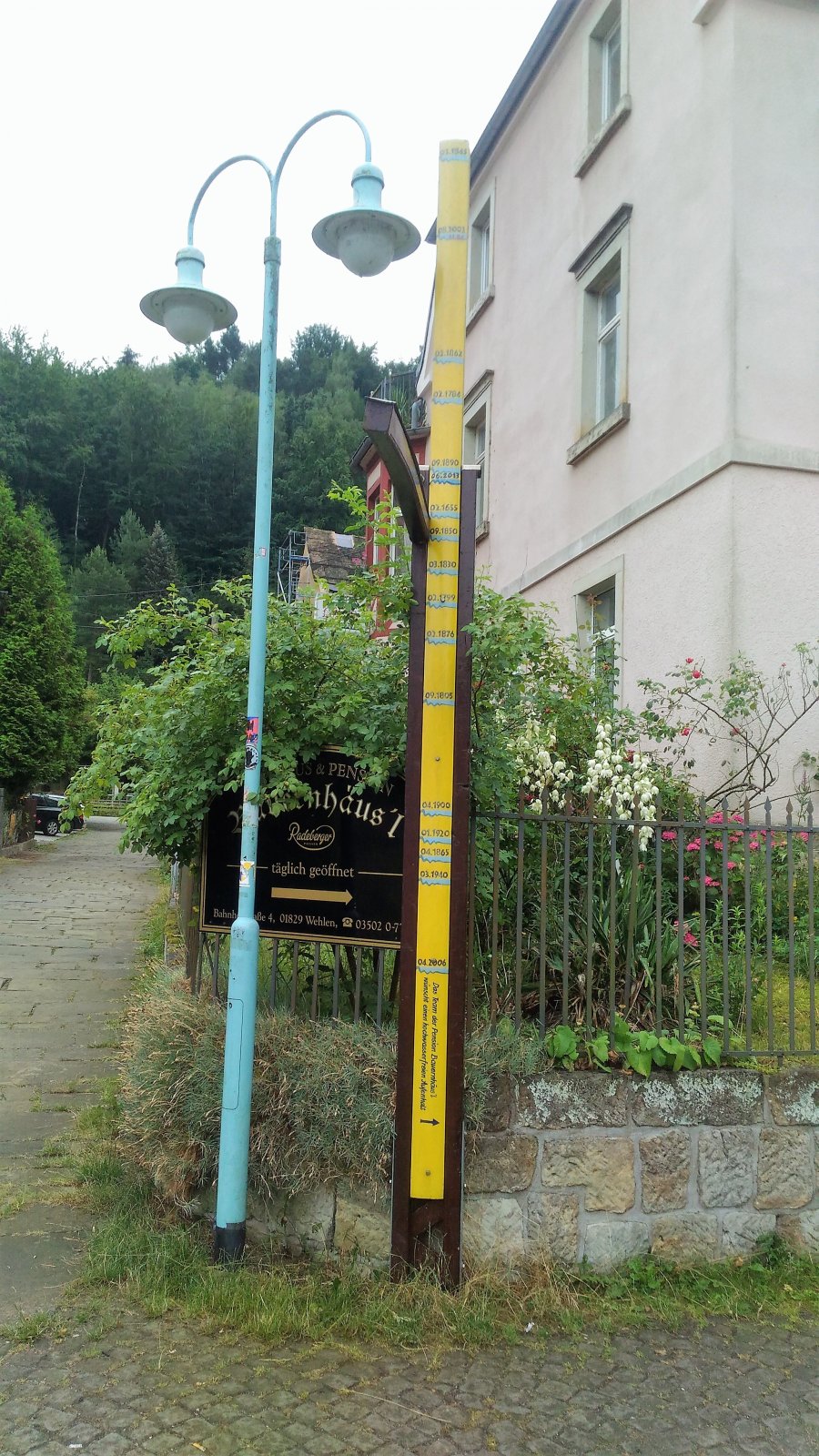Tak jako v mnoha městech a vesničkách mezi Hřenskem a Drážďany tak i ve Wehlenu je vodoznak, který ukazuje, do jaké výšky vystoupala voda při povodních.