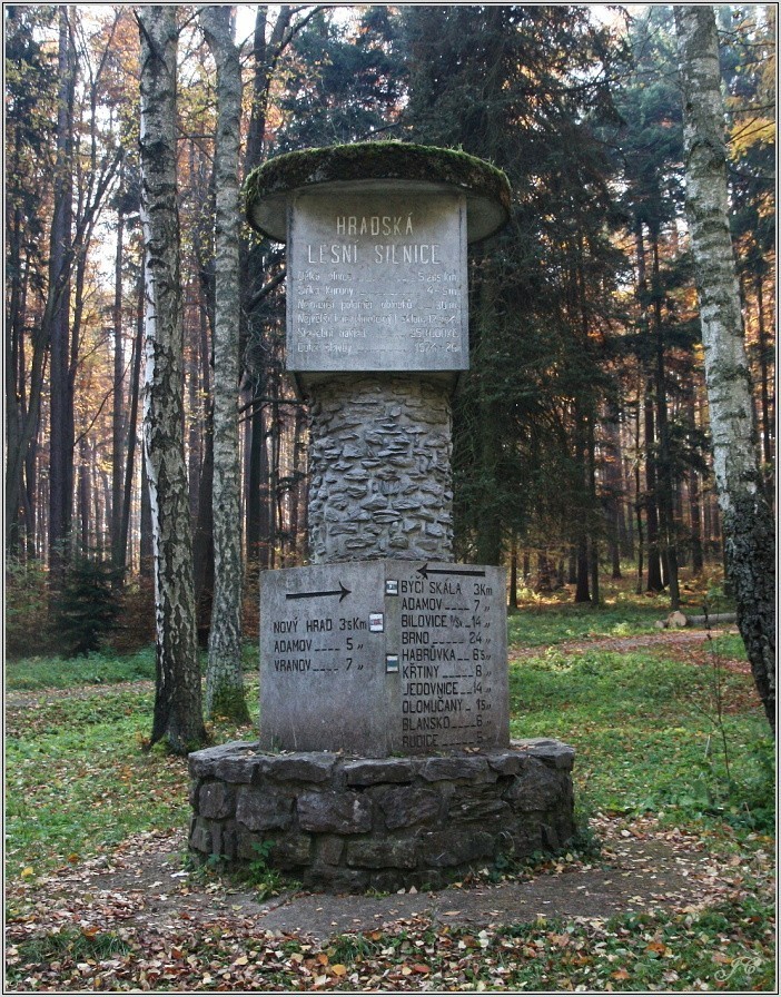 Byl vybudován v roce 1937 na křižovatce turistických a lesních cest na památku výstavby tzv. Hradské cesty. Tato více než 5 km dlouhá cesta spojující Olomučany, Nový hrad (proto název Hradská) a údolí řeky Svitavy byla postavena v letech 1924 – 26. Památník je čtyřhranný a na jeho jednotlivých plochách najdete rozcestník s kilometráží, sluneční hodiny, informace o stavbě cesty a také citáty Anatola France („Kdybych měl zvolit mezi pravdou a krásou, nebyl bych ani vteřinu na rozpacích, zvolil bych si krásu, neboť jsem přesvědčen, že krása v sobě tají vyšší pravdu, než pravda sama“) a I. S. Turgeněva („Jděte kupředu, pokud můžete, ale klesnou-li pod Vámi nohy, sedněte si nedaleko cesty a dívejte se na další mimojdoucí bez hněvu a závisti, vždyť ani oni daleko nedojdou“).
