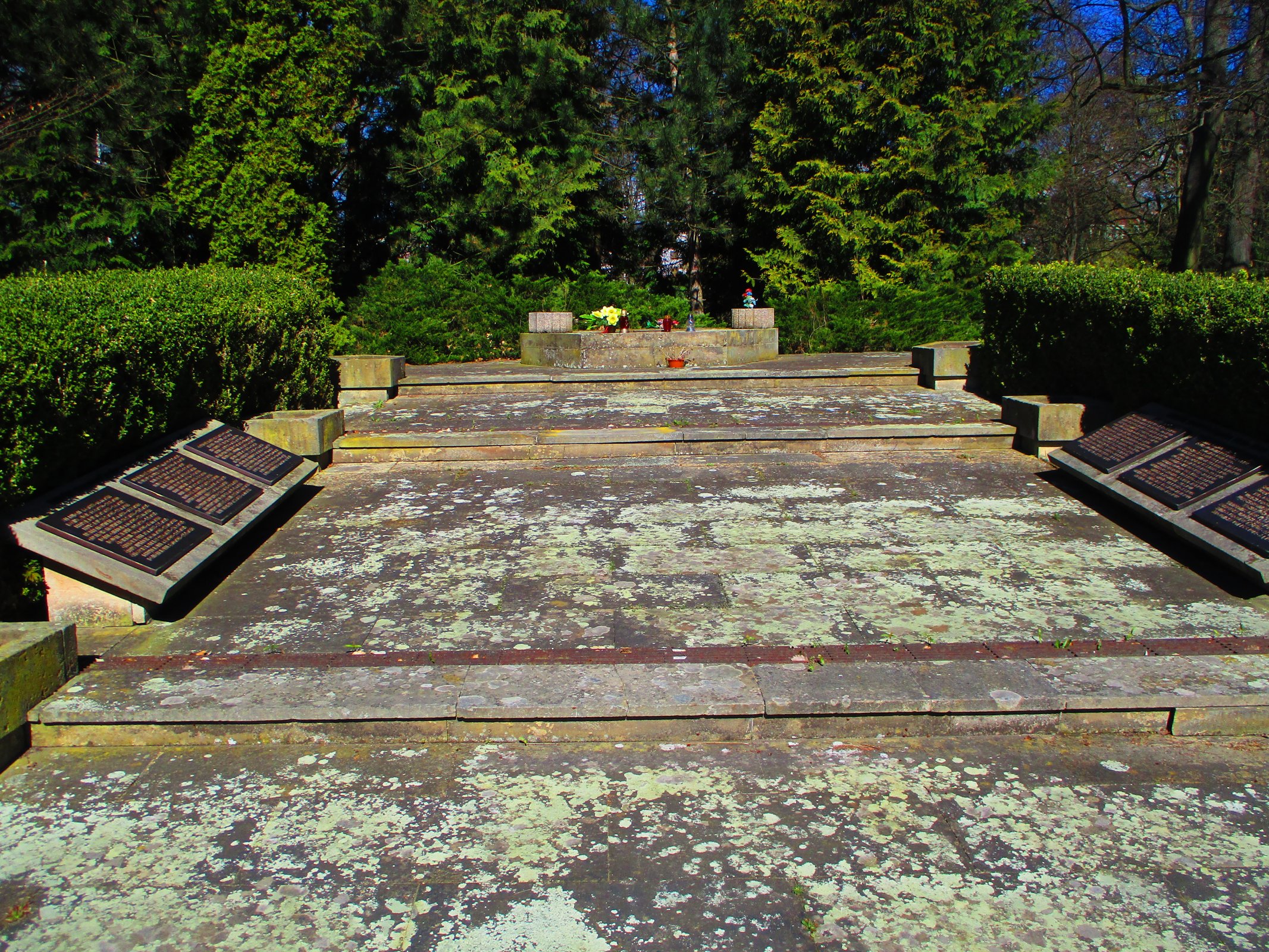 O zřízení památníku, později označovaného jako pomník obětem 2. světové války, bylo jednáno na zdejším MNV nějakou dobu. Teprve v říjnu 1979 byly zahájeny práce na jeho vybudování, a to v parkové části města naproti divadlu. Jeho dominantou se měla stát socha příslušníka Rudé armády. Práce byly naplánovány tak, aby byl památník slavnostně odhalen u příležitosti oslav 35. výročí osvobození Československa Sovětskou armádou. Návrh a realizaci přes 3 m vysoké pískovcové sochy sovětského vojáka provedl akademický sochař Ladislav Zemánek z Doudleb nad Orlicí a na této realizaci se rovněž podílel Antonín Wagner ze Dvora Králové nad Labem. Kromě sochy rudoarmějce, držícího v pravé ruce samopal hlavní k zemi (jako symbol ukončení války), byla v těchto místech před ní umístěna šestice pamětních desek s nápisy: "PADLÝM SPOLUOBČANŮM 1939 - 1945 ČEST JEJICH PAMÁTCE APL RUDOLF 4.6.1887-14.11.1944, BAČINA ALOIS 13.3.1920-23.8.1940, BEDNÁŘ JAN 18.12.1897-9.6.1942, BENEŠ JAN 26.2.1907-29.1.1944, BEZDĚK FRANTIŠEK 15.1.1896- 13.3.1943, GEN. BLÁHA FRANTIŠEK 26.2.1886-21.5.1945, BOŘEK OLDŘICH 1.11.1909-27.11.1944, BOUČEK ZBYNĚK 30.5.1926-5.5.1945, ČECH EMIL 20.1.1908-17.11.1944, ČERMÁK KAREL 19.1.1897- 7.5.1945, ČERNÝ JINDŘICH 16.11.1907-27.10.1944, ČEŘOVSKÝ LADISLAV 22.6.1885-21.3.1945, DERNER KAREL 1.8.1909-23.5.1945, DOLEČEK KAREL 8.10.1907-25.5.1943, DVOŘÁKOVÁ VALERIE 25.11.1932-5.5.1945, FAJMAN STANISLAV 13.10.1904-15.1.1945, FEJFAR JOSEF 15.11.1896-1942, FEJKOVÁ ANNA 30.3.1895-8.9.1944, FEJK KAREL 17.12.1893-8.9.1944, FELIX IVAN 10.6.1931-7.3.1944, FELIX LUDVÍK 7.3.1927-7.3.1944, FELIX MILAN 19.9.1922-7.3.1944, FELIXOVÁ MARIE 5.9.1899-7.3.1944, FENDRYCH JINDŘICH 1.1.1915-19.3.1945, FIEDLER JIŘÍ 2.7.1914-6.4.1943, FRANKENSTEIN HUGO 24.4.1894-23.1.1943, FRANKENSTEIN JOSEF 5.8.1865-5.1.1944, FRANKENSTEINOVÁ OTYLIE 22.7.1869-14.2.1944, FRIES RICHARD 12.7.1889-1.10.1944, GAISLOVÁ MALVY 26.7.1883-23.1.1943, HAMPL ANTONÍN 17.5.1942, HLAVENKOVÁ VLASTA 24.1.1890-, HNILICA JAN 22.6.1887-19.5.1945, HOFMAN FRANTIŠEK 25.12.1877-20.10.1943, HÖNIGOVÁ AURELIE 14.4.1893-6.9.1943, HÖNIG EMIL 12.3.1879-6.9.1943, HÖNIG GERHARD 7.7.1915-23.1.1943, ING. HÖNIG NORBERT 26.12.1912-23.1.1943, HORÁK RUDOLF 1.12.1913-15.11.1943, IVANOV ANTONÍN 10.6.1890-24.10.1942, JANATA MIROSLAV 6.5.1881-21.4.1943, JANKO JAROSLAV 24.3.1920-1945, JANKO OLDŘICH 26.11.1910-1.3.1945, JAKOBEC MIROSLAV 19.5.1913-5.5.1945, KRIEGLER LADISLAV 15.4.1916-30.6.1944, KRIEGLEROVÁ MARIE 22.2.1878-1.3.1944, KRPATA FRANTIŠEK 2.9.1892-16.12.1943, GEN. KUBÁŇ METHOD 18.9.1885- 5.3.1942, LAUFER MOŘIC 14.7.1861-15.5.1943, LEDEREROVÁ ARNOŠTA 10.11.1870-15.12.1943, LEDEREROVÁ MARTA 30.12.1902-23.1.1943, LIBŘICKÝ FRANTIŠEK 17.1.1882-25.6.1942, LIBŘICKÝ JAROSLAV 4.7.1908-18.6.1943, LUDVÍK VOJTĚCH 24.5.1908-23.11.1943, MÜNZEROVÁ ELIŠKA 6.1.1892- 31.1.1942, MÜNZER MAXMILIÁN 28.2.1885-31.1.1942, PETR ADOLF 24.6.1923-9.1942, POHNER BENEDIKT 23.4.1912-25.2.1941, POUR AUGUSTIN 19.2.1905-20.3.1942, POUZNAR JOSEF 1923-, PROCHÁZKA KAREL 28.1.1909-10.5.1945, ROUBÍČEK MAXMILIÁN 24.1.1887-31.10.1944, RUDOLF OTAKAR 17.3.1887-5.1945, RŮŽIČKA JOSEF 12.12.1893-29.3.1945, SAJENKO JIŘÍ 20.9.1927-12.4.1945, STEINER EDUARD 28.5.1866-17.4.1944, STEINER LEOPOLD 10.8.1896-3.7.1943, STEINEROVÁ REGINA 1.5.1871-17.4.1944, STEJSKAL FRANTIŠEK –24.5.1941, STRUŽKOVÁ ANDĚLA 14.1.1912-8.5.1945, STŘIHAVKA VÍTĚZSLAV 15.5.1900-14.11.1944, ŠMAHEL ALOIS 4.3.1887-15.6.1942, PHDR. ŠAŠKOVÁ GERTRUDA 20.11.1896-3.7.1942, ŠOLÍN MIROSLAV 9.5.1917-10.12.1942, ŠPAČEK FRANTIŠEK 11.12.1879-17.5.1945, ŠPANIEL IVAN 23.7.1918-30.11.1944, ŠRŮTEK OLDŘICH 18.2.1905-18.8.1944, ŠUBRT STANISLAV 3.11.1897-6.4.1943, TYLŠ JOSEF 27.11.1888-10.12.1943, ULRICH JAROSLAV 22.2.1912-8.4.1943, ULRYCH FRANTIŠEK 30.11.1898-6.4.1944, VACHEK VÁCLAV -5.10.1944, WINTERNITZ JOSEF 14.4.1902-23.1.1943, ZÁKRAVSKÝ JINDŘICH 20.2.1915-26.9.1944, ZMÍTKO JAROSLAV 4.7.1907-27.10.1942, ŽEROVNICKÝ JAN 15.5.1912-7.1.1942" (viz https://www.vets.cz/vpm/8622-pomnik-obetem-2-svetove-valky/#8622-pomnik-obetem-2-svetove-valky).