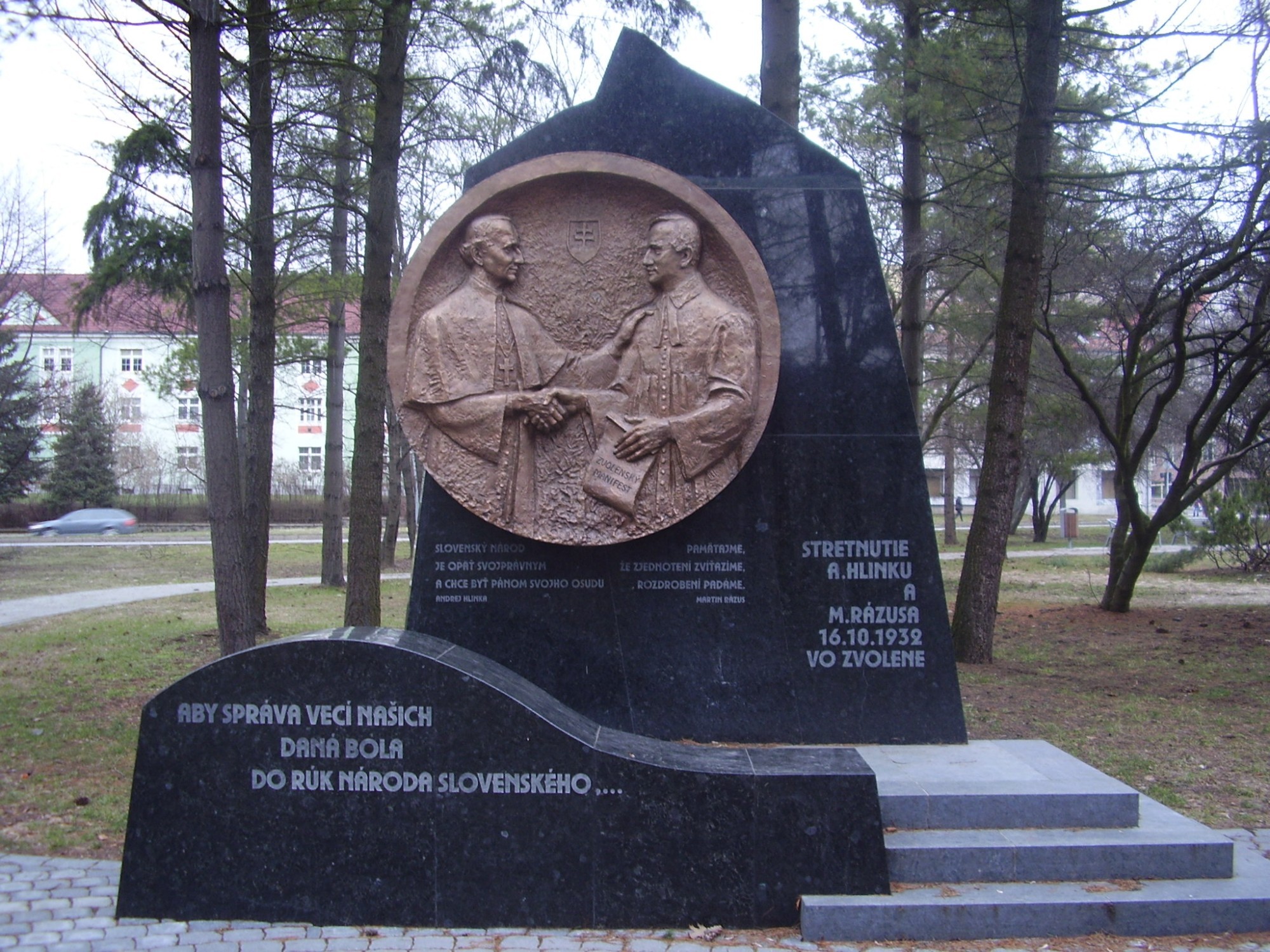 Pamätník Zvolenského manifestu bol slávnostne odhalený 22. júla 2011. Pripomína historické stretnutie Andreja Hlinku a Martina Rázusa 16.10. 1932 vo Zvolene. Autormi sú akadememický sochár Ladislav Berák a Roman Toman. Ďalej spolupracovali A. Beráková, M. Berák, O. Lipták, J. Konuš, K. Gubán a J. Zajac. Najviac sa o výstavbu postarala SNS a mesto Zvolen. Občania mesta Zvolena si týmto pamätníkom pripomenú dobu emancipačného snaženia Slovákov o samostatný štát.
