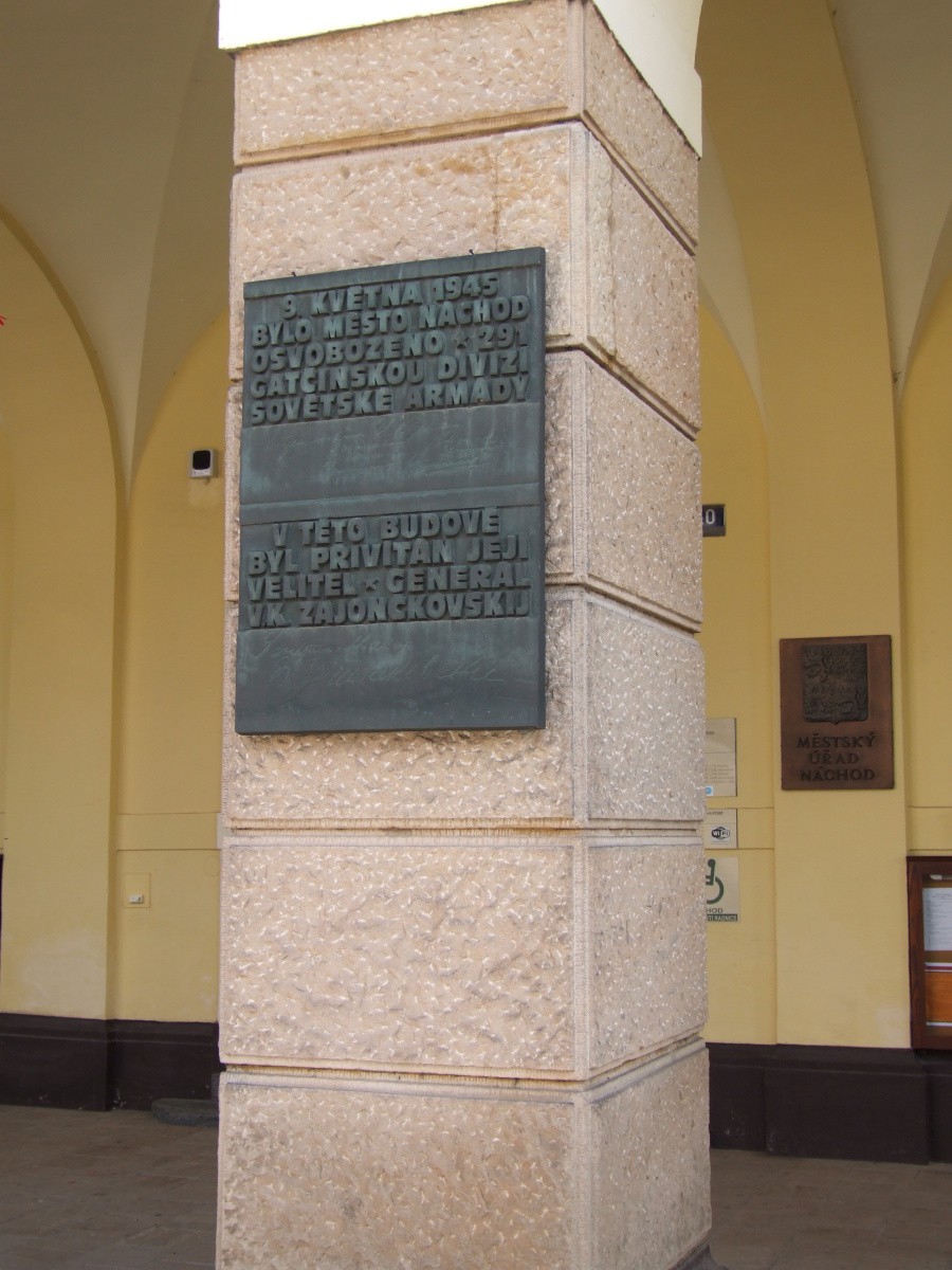 Na paměť osvobození města Náchoda od německé okupace na konci druhé světové války byla v roce 1985 slavnostně odhalena pamětní deska na nárožní budově nové radnice na dnešním Masarykově náměstí. Bronzová deska je umístěná na středním pilíři loubí radnice a obsahuje 2 nápisy: „9. května 1945 bylo Město Náchod osvobozeno 291 Gatčinskou divizí Sovětské armády“ a „V této budově byl přivítán její velitel generál V.K. Zajončkovskij“. Mezi oběma nápisy jsou potom vyobrazeny faksimile podpisů velitelů a pod druhým nápisem je umístěna faksimile podpisu generála Zajončkovského.