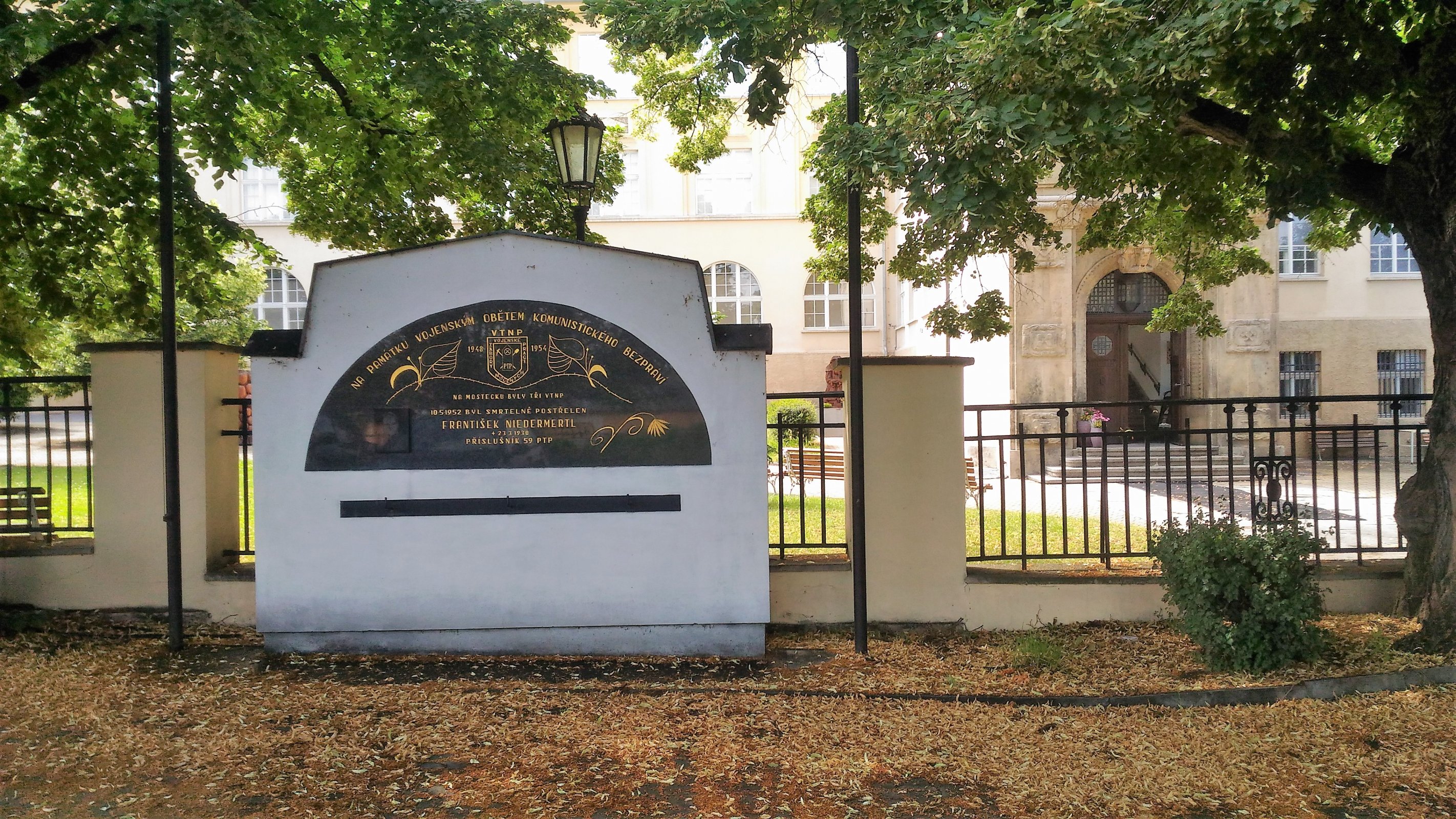 Na desce je portrét Františka Niedermertla, který byl 10.5.1952 zastřelen členem vojenské eskorty v mosteckých kasárnách,emblém vojenských táborů nucených prací a nápis – Na památku vojenským obětem komunistického bezpráví.