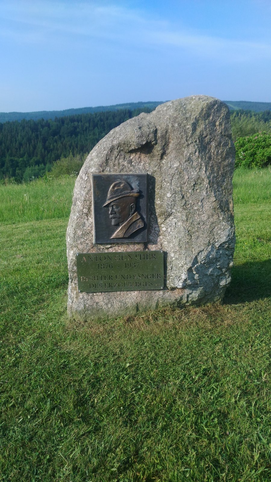 Na návrší nad Deutschneudorfem je pěkné upravené odpočinkové místo s pamětním kamenem Antona Gűnthera.