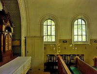 Severní i jižní stěna kaple je prolomena čtveřicí půlkruhově zaklenutých oken, pod nimiž se vždy nachází dvojice dřevěných konzol. Presbytář je osvětlen protáhlým oknem s dřevěnou výplní. Štít předsíně nad vstupem zdobí dřevěný jetelový kříž. Interiér kaple přístupný běžně nebývá a nedá se ani nahlédnout „přes mříž“.
