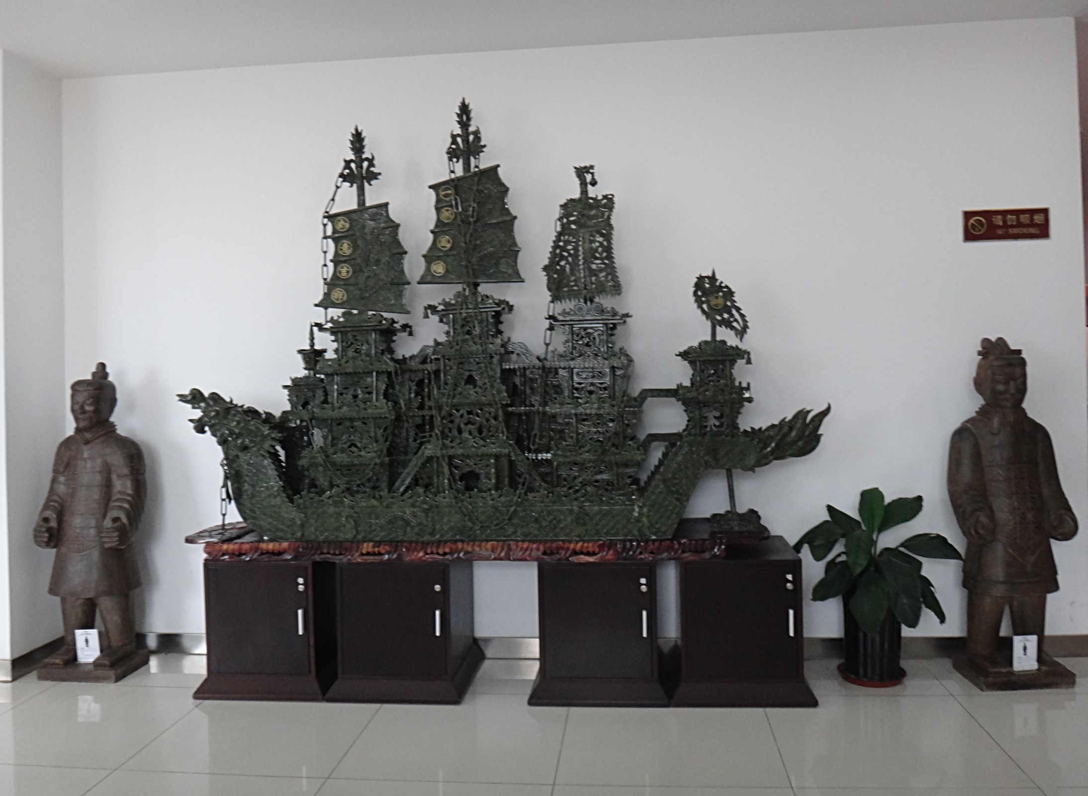 Jdeme do dílny, kde se vyrábí fascinující předměty z nefritu, ale i obdivuhodně krásné obrázky, paravány, nábytek a další předměty. Již při vstupu do budovy vás uchvátí nádherné čínské kultovní předměty, trojstěžník z jediného kusu kamene, draci, koně či ptáci. Dostáváme se přímo do dílny, kde pracovník brousí kámen ve tvaru koule, je to vlastně několik koulí v kouli. V jednotlivých místnostech jsou vystaveny nefritové sošky s udáním ceny a jedná se opravdu o nemalé částky. Na stěně jedné z místností vidíme fotografii olympijských medailí. Na medailích kolem loga je nefritový kruh, stužku drží dva draci. Zlatou medaili zdobí vzácný bílý, nazývaný měsíční světlo, na stříbrné je nefrit zelený a na bronzové černý. Opět přecházíme do velkého obchodu s nepředstavitelným množstvím těchto výrobků. U jednoho z pultíků kreslí muž barevné obrázky s čínskými motivy.