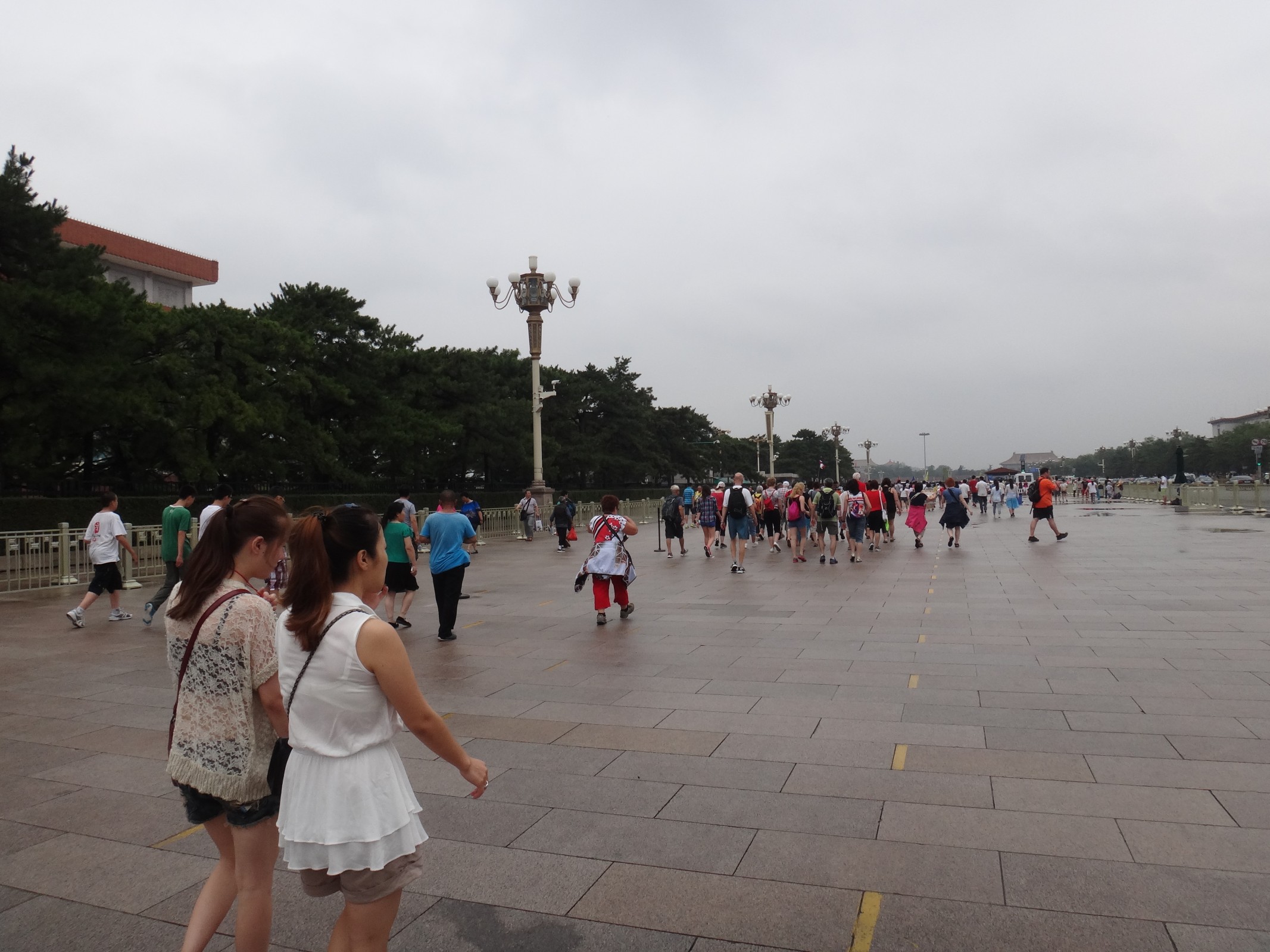 Prohlídku hlavního města Číny - Pekingu jsme začali na náměstí Tiananmen - náměstí Nebeského klidu. Jedná se o největší veřejné náměstí na světě u Brány nebeského klidu, odtud jeho název. Je to geografické i duchovní centrum města a symbolicky představuje samotné srdce Číny. Je to obrovská vydlážděná plocha v centru Pekingu o rozloze 40 ha. Právě zde 1.října 1949 Mao vztyčil rudou vlajku a vyhlásil vznik Čínské lidové republiky. V minulých dobách se nepovolovala místa, kde by se mohl shromažďovat lid, náměstí v dnešní podobě vzniklo v nové době po odstranění císařskýh úřadů a stržení zdí. Do dnešní velikosti bylo náměstí rozšířeno až kolem roku 1960 a Strana nařídila výstavbu 10 vládních budov v sovětském stylu. Náměstí leží na severojižní ose od Přední brány k Mauzoleu předsedy Maa, prochází Branou nebeského klidu a vede přes Zakázané město. Na náměstí se může jen chodit (nesmí se jezdit např. na kole), kolem jsou zábrany a přilehlé silnice jsou jednosměrné.