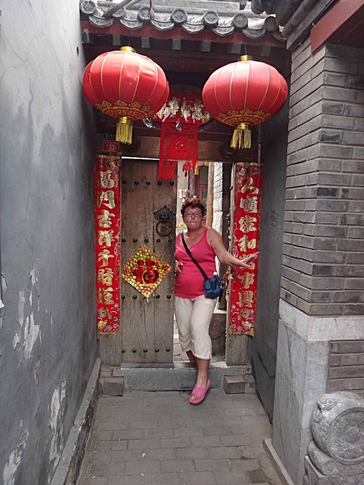 Do starého pekingského domu v hutongu jsme se byli podívat na jedné ze zastávek v rámci jízdy rikšou. Vchodová vrata a brána jsou vyzdobeny čínskými lucernami - lampiony. Vcházíme na nádvoří, na jehož obvodové zdí jsou přilepeny jednotlivé pokoje. Máme možnost nahlédnout do ložnice, pokoje, dětského pokoje, hráčské místnosti, kuchyně a dalších místností, do kterých se vchází po několika schůdcích. Podle kuchyně usuzujeme, že dům neslouží jen jako ukázka pro turisty, ale je snad i obýván. V jedné z místností mladík vyrábí suvenýry, v další nalézáme klobouky, které si zkoušíme a další slouží jako skladiště. Domy v hutongu nesloužily jen jako bydlení, ale i jako místo setkávání sousedů a povídání si s nimi, ke hrají karet, domina a mahjongu. Na dvorku domu usedáme do židle a zaposloucháváme se do zvuku cikád v klecích.