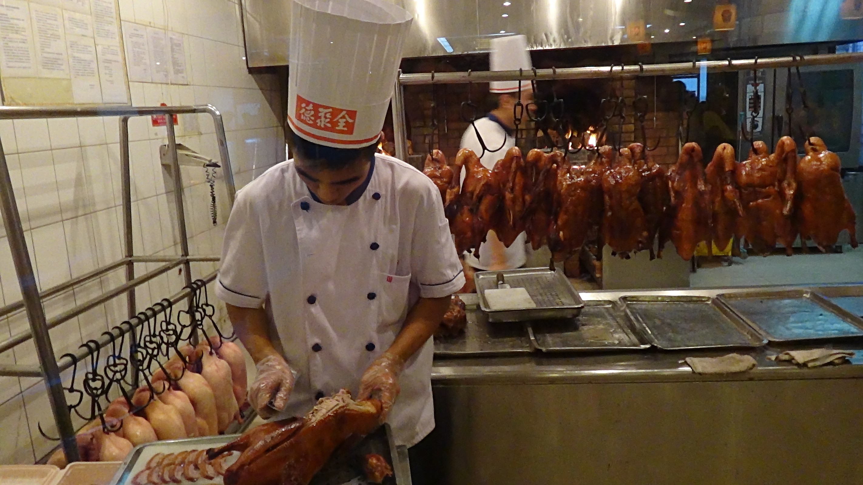 Příprava večeře pekingská kachna začíná již při procesu samotného chovu kachen. Kachny se krmí speciální výživnou krmnou směsí připravenou z různých ingrediencí dva měsíce do váhy 2 - 2,5 kg. To vše, aby jejich masíčko bylo křehoučké a kůžička tenoučká. Tato nejznámější gastronomická lahůdka čínské kuchyně byla známá již v dávné historii, ve 14. stol. v období císařské dynastie Ming. Moc jsme se na ni těšili, že uvidíme celý proces přípravy. Průvodkyně říkala, že jdeme do jedné z nejlepších restaurací v Pekingu. Jak se restaurace jmenovala nevím, protože na budově byl jen čínský nápis, interiér restaurace byl celkem hezky vyzdoben. Nejdříve se jdeme podívat na místo, kde již visí upečené kachny. Pak již usedáme ke kulatému stolu pro 10-11 osob s otáčivým tácem uprostřed. Speciálně vyučený kuchař kachnu porcuje přímo u našeho stolu. Údajně na 120 tenoučkých, téměř průsvitných proužků s kůžičkou, sádlem a masíčkem. Pak je nám předváděno, jak se má kachna jíst. Proužky kachny namočené ve švestkové omáčce se položí na placku, přidá se zelenina a placka se složí do obdélníčku. Chvíli se potýkáme s hůlkami, některým se to podaří a když to nejde používáme příbor králů - ruce. K večeři na stole jsou ještě i jiné druhy masa, samozřejmě rýže a trochu zeleniny. K pití si můžete vybrat víno, pivo nebo nealko, dále je k dispozici konvice čaje. Polévku Číňané jí až nakonec, nám nechutnala, protože žádnou chuť neměla. Večeře stála 20 USD, za ty peníze to ale ani nestálo. Myslím, že v čínských restauracích u nás je jídlo chutnější.