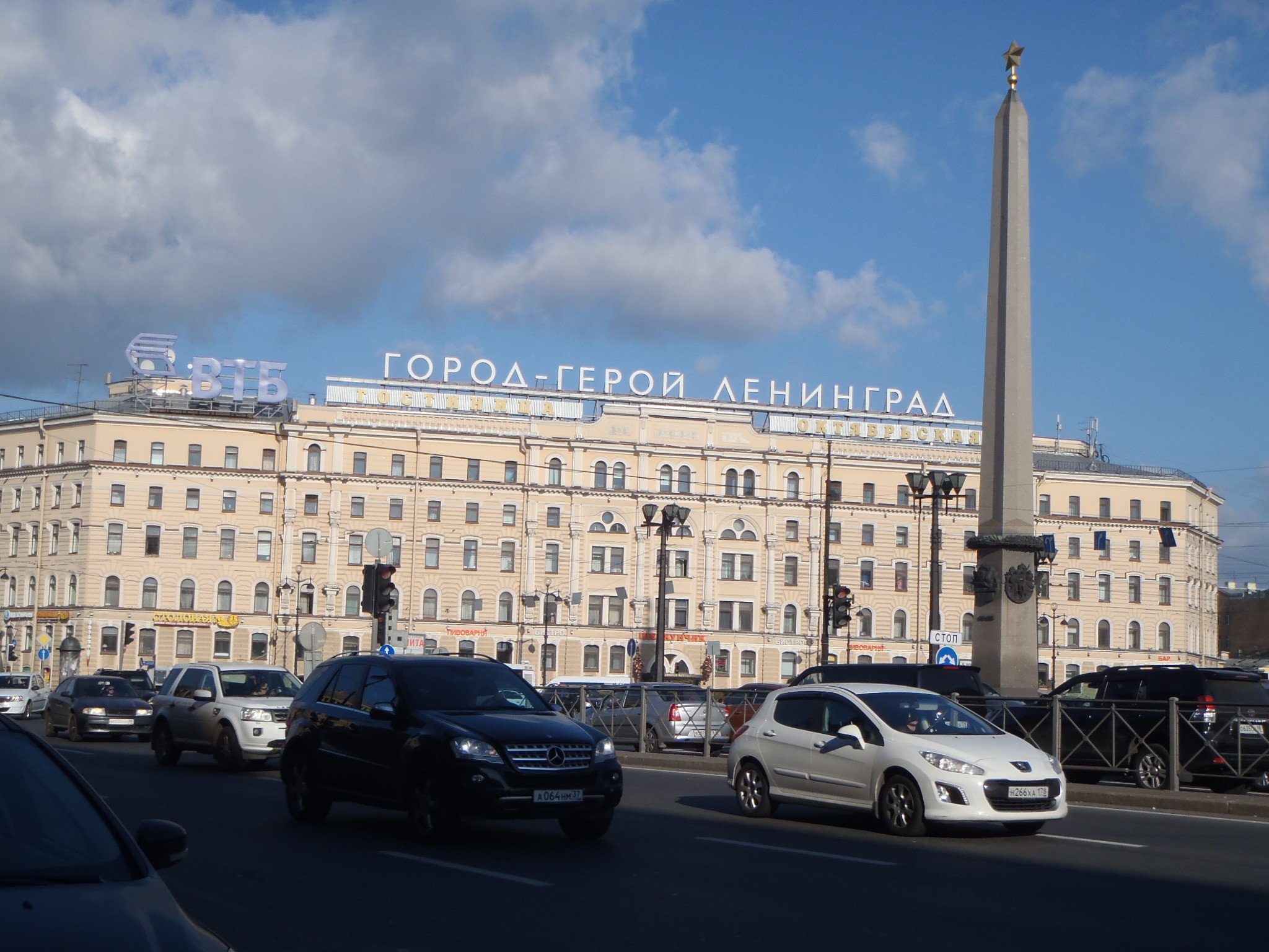 Připomínkou leningradské blokády během 2. světové války je nápis na střeše hotelu Oktjabrskaja : Gorod Geroj (město Hrdina) Leningrad.