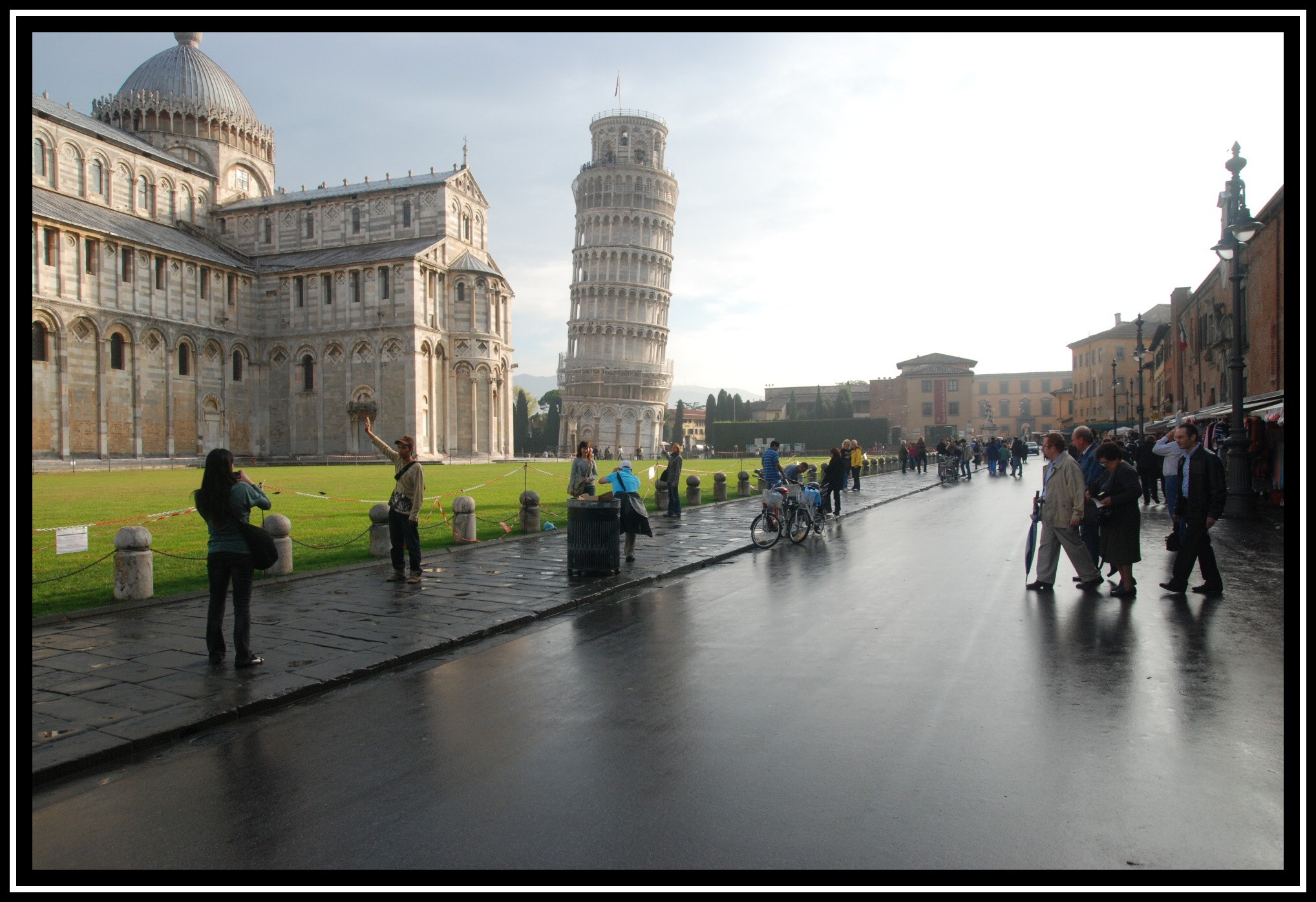 Torre Pendente - Šikmá věž se začala stavět v roce 1173 a stavěla se na etapy. Měla být nejvyšší věží na světě, ale když se začala naklánět, byla ukončena šestým patrem se zvonicí r. 1350. Dnes je zajištěna lany proti dalšímu naklánění a její odchylka od svislé osy je 5 m. Vedle věže je pomník zakladatelů Říma – Romulus a Remus sající vlčici.