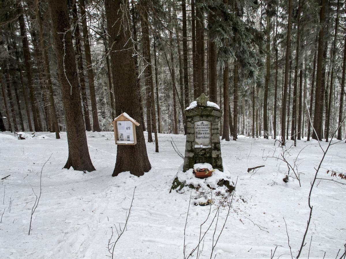Zděný pomník z lomového kamene připomíná mramorovou deskou v textu, že zde zahynuli při úderu blesku do stromu dva mladí sourozenci. Podle textu ve vývěsní skřínce se sourozenci chystali na pouť v nedalekých Jakubovicích. Bylo ovšem před bouří, takže ještě zaběhli na louku uklidit seno do kup. Doprovázel je ještě nejmladší bratr. To ještě stihli, ale při zpáteční cestě už je povětří zastihlo. Poučka praví, že se nemáme schovávat pod osamělým stromem, to zřejmě nešťastníci dodrželi. Lesík tu zřejmě byl i tenkrát, byť asi menší. Místo se označuje jako Šafářova smrčina. Strom, kde se ukryli byl zasažen bleskem a sjel do mladých lidí. Nápis prozrazuje, že „Dne 27.7.1925 byli na tomto místě zabiti bleskem Žofka a Alois Ruprichovi.“ Blesk zasáhl i nejmladšího Dominika, ten ale neštěstí přežil. Žofii bylo 22 let, Alois stár 17 roků.