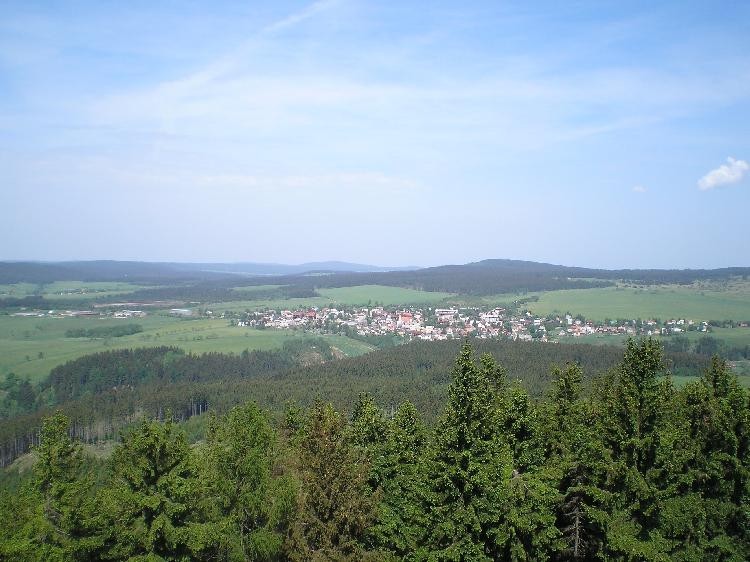 z rozhledny: Jelení hřbet vpředu, dále pak Tisovský vrch s rozhlednou, za ním Komáří vrch a Špičák (Kraslický)