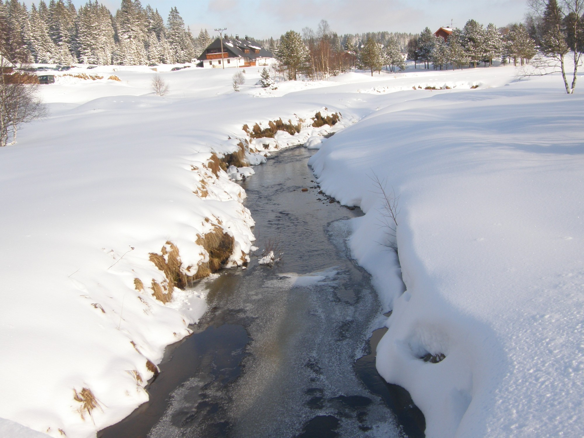 Jen občas vykoukne žulový kámen ze zasněženého koryta Vydry.