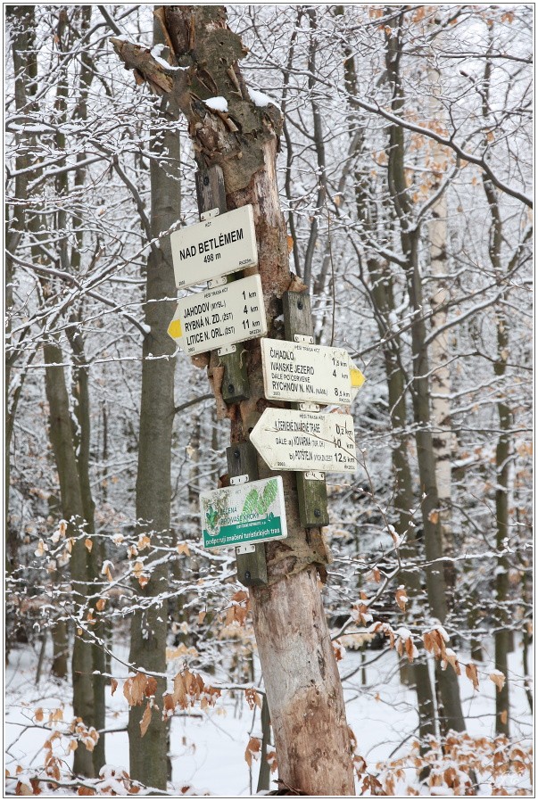 Rozcestí žluté značky se nachází Pod Jahodovou horou (502 m n.m.) na východ od Rychnova nad Kněžnou.