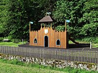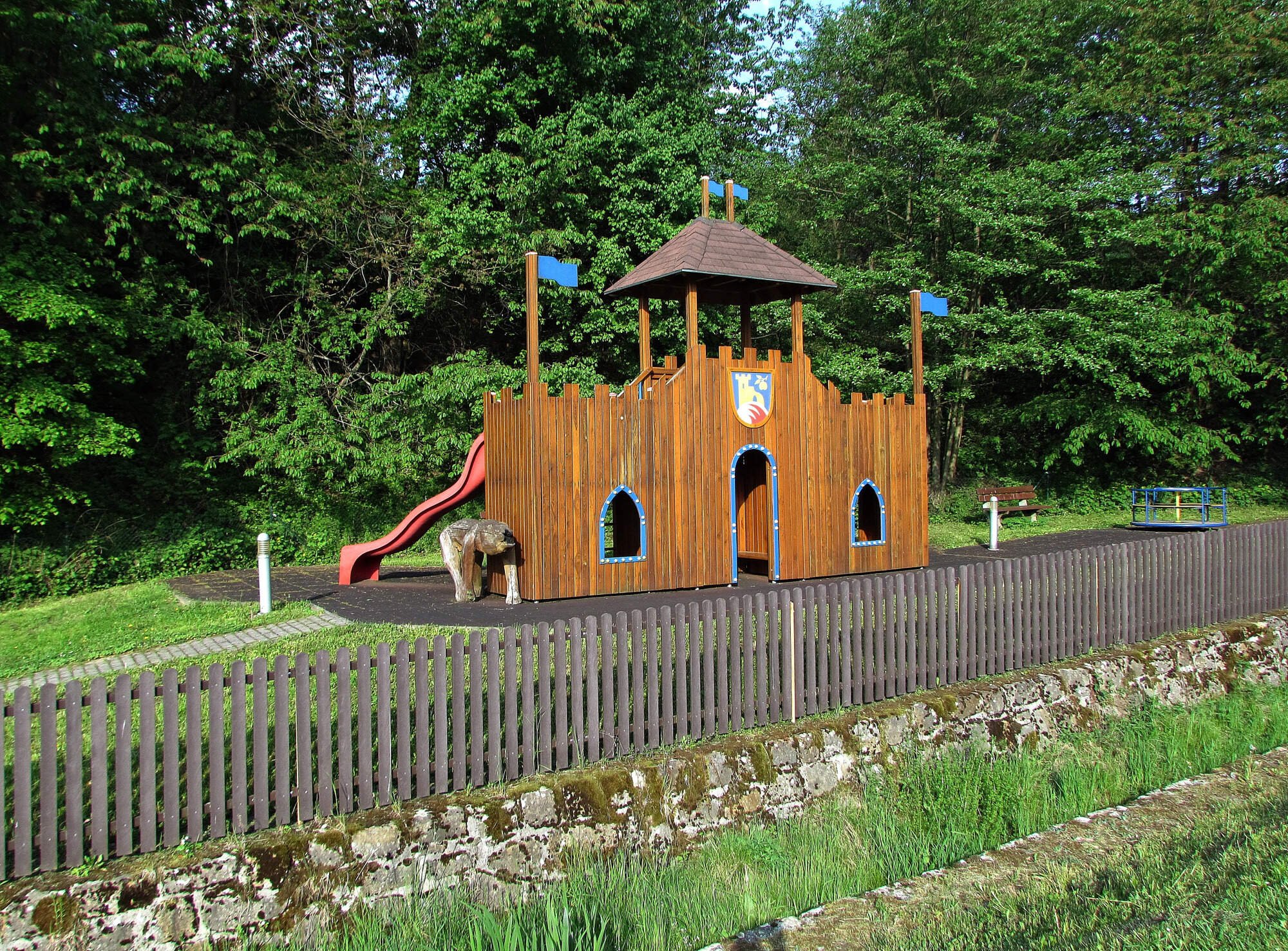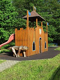 Jak se tak toulám naší krajinou a lidskými sídly, kolikrát vidím, že v menších vesnicích mají kolikrát daleko hezčí a nápaditější veřejná hřišťátka pro nejmenší, než jaká se nacházejí ve větších obcích a ve městech. To platí i pro obec Podhradí stulenou v dolince pod pozůstatky hradu Starého Světlova. Na zdejší novější dětské hříště narazíme, pokud budeme od autobusové točny na spodním konci dědinky stoupat po silnici severním směrem do jejího středu. Po asi 70 m chůze je uvidíme rozložené na palouku pod svahem naproti za potokem, přes který k němu vede lávka. Zaujme hlavně zajímavý dřevěný hrad se skluzavkou a skulpturou plížícího se vlka, dále je tu k vidění plastika hlemýždě a ptáka. V příjemném odpočinkovém areálu nechybí ani lavičky k posezení a dřevěný přístřešek.