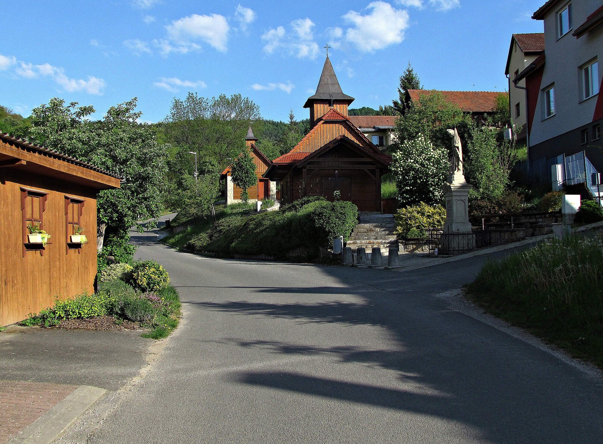 Schody ke kapli vedou od sochy sv.Floriana (vysvěcena 2019) stojící u obecního úřadu.