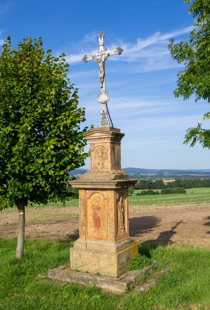 Na dřík navazuje širší římsa s navazujícím podstavcem kříže. Ten tvoří nižší zkosený základ, pokračující hranolovým sloupkem s reliéfem poháru na čele. Tato část je zakončena kaplicovou stříškou. Vrchol tvoří masivní železný kříž s ukřižovaným. Kříž je zdoben rostlinnými dekory v základně i v ramenech kříže.