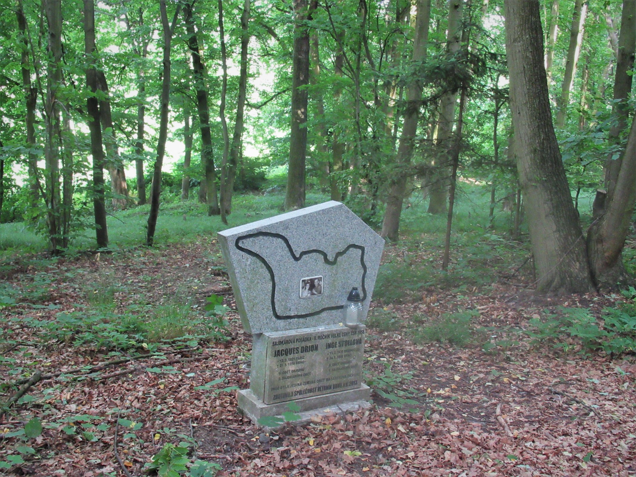 Brněnská Velká cena byla vždy velkým svátkem pro motoristickou veřejnost. Ještě v době, kdy se jezdilo na venkovních okruzích kolem Brna, byly v době konání závodů po celé délce trati hojně navštěvovány diváky. V roce 1958 zařadili organizátoři závodu novou kategorii sajdkáry, která měla udělat celé dění ještě aktraktivnější. Závod se tehdy konal v neděli 24. srpna. Na trati dlouhé 17,8 km se pro tuto kategorii jely čtyři okruhy. Závodu se zůčastnila i zámá francouzsko-německá dvojice Jacques Drion a Ingeborg Stollová. Na této Velké ceně Brna je však postihla nehoda a Inge Stollová zemřela na místě, Jacques Drion podlehl o den později vážným zraněním v nemocnici. Ingeborg byla jedna z mála žen, které na Velké ceně v Brně závodily. Jednalo se o osmou a devátou oběť Masarykova okruhu. Jejich smrt dnes připomíná kamenný pomníček v malém lesíku a opodál je i původní dřevěný. Místo tragické události se nachází kousek od světelné křižovatky mezi bývalou tratí vedoucí od Žebětína a dnešní širokou komunikací tzv. Hitlerovy dálnice.